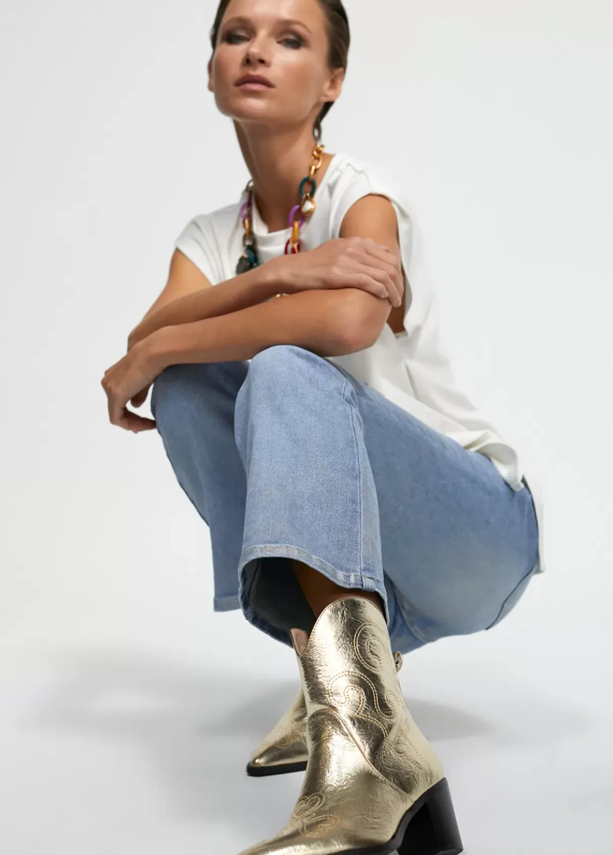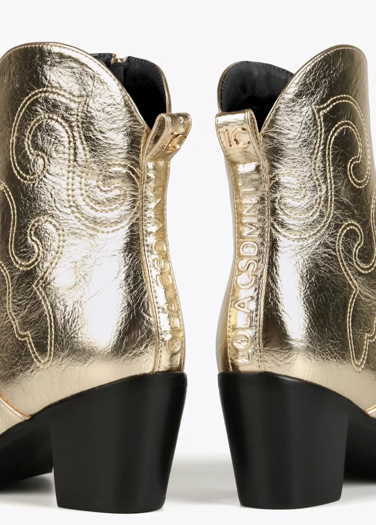 Botín estilo cowboy metalizado pespunteado y con cremallera en los laterales. Tira trasera logotipada y letras logo doradas.