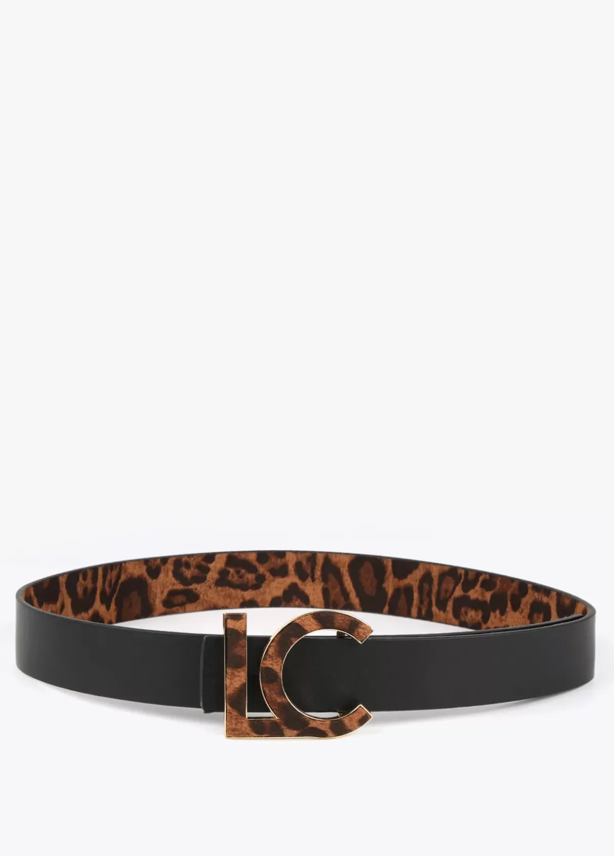 Cinturón en efecto piel reversible animal print y negro. Letras logo forradas en animal print a modo de hebilla.