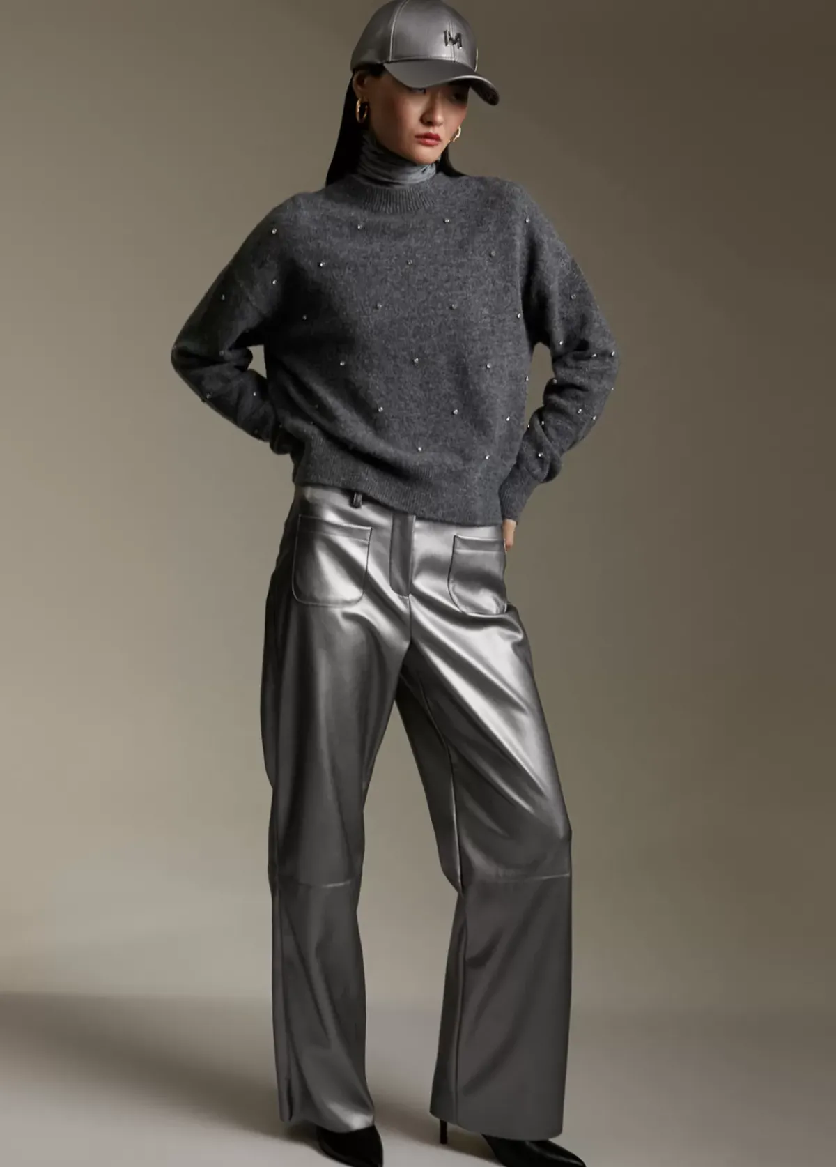 Jersey de cuello caja y manga larga. Rib en canalé en cuello, piños y bajo. Detalle de cristales en frontal y mangas.