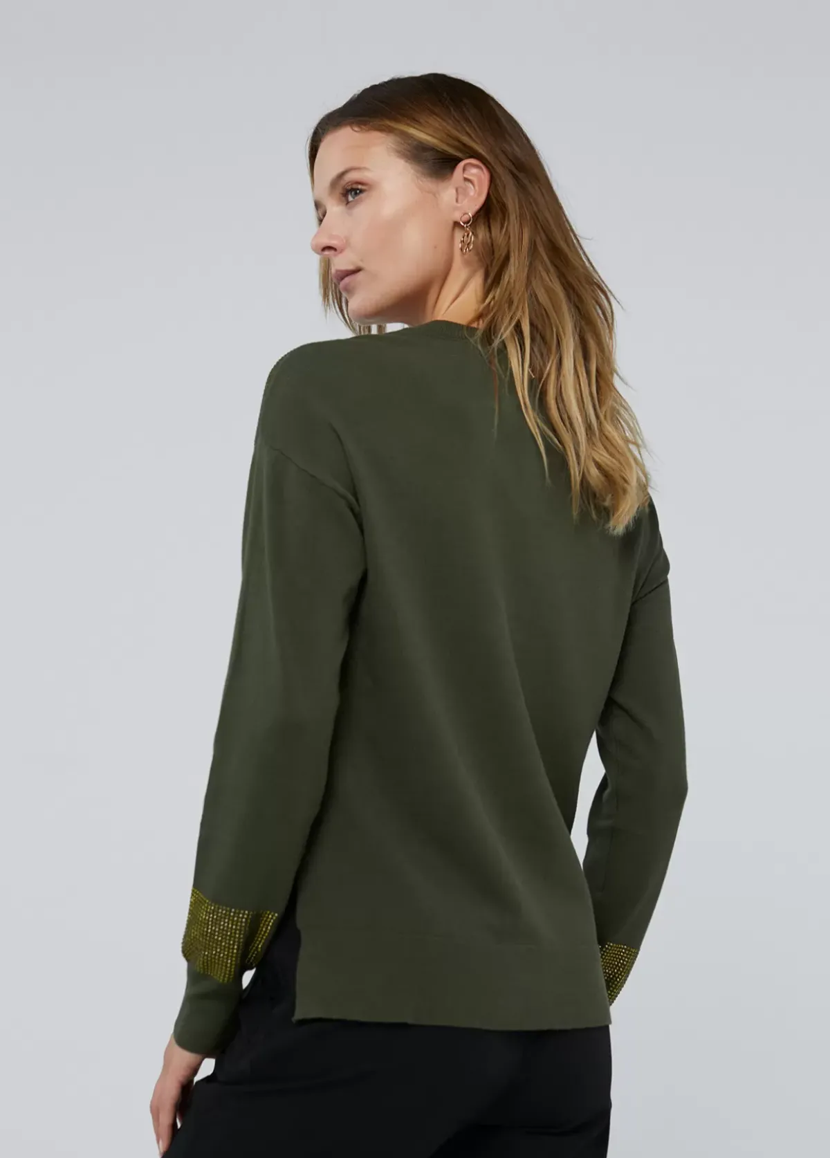 Jersey cuello caja y manga larga. Detalle de strass a tono en logo central, hombros y bajo manga.