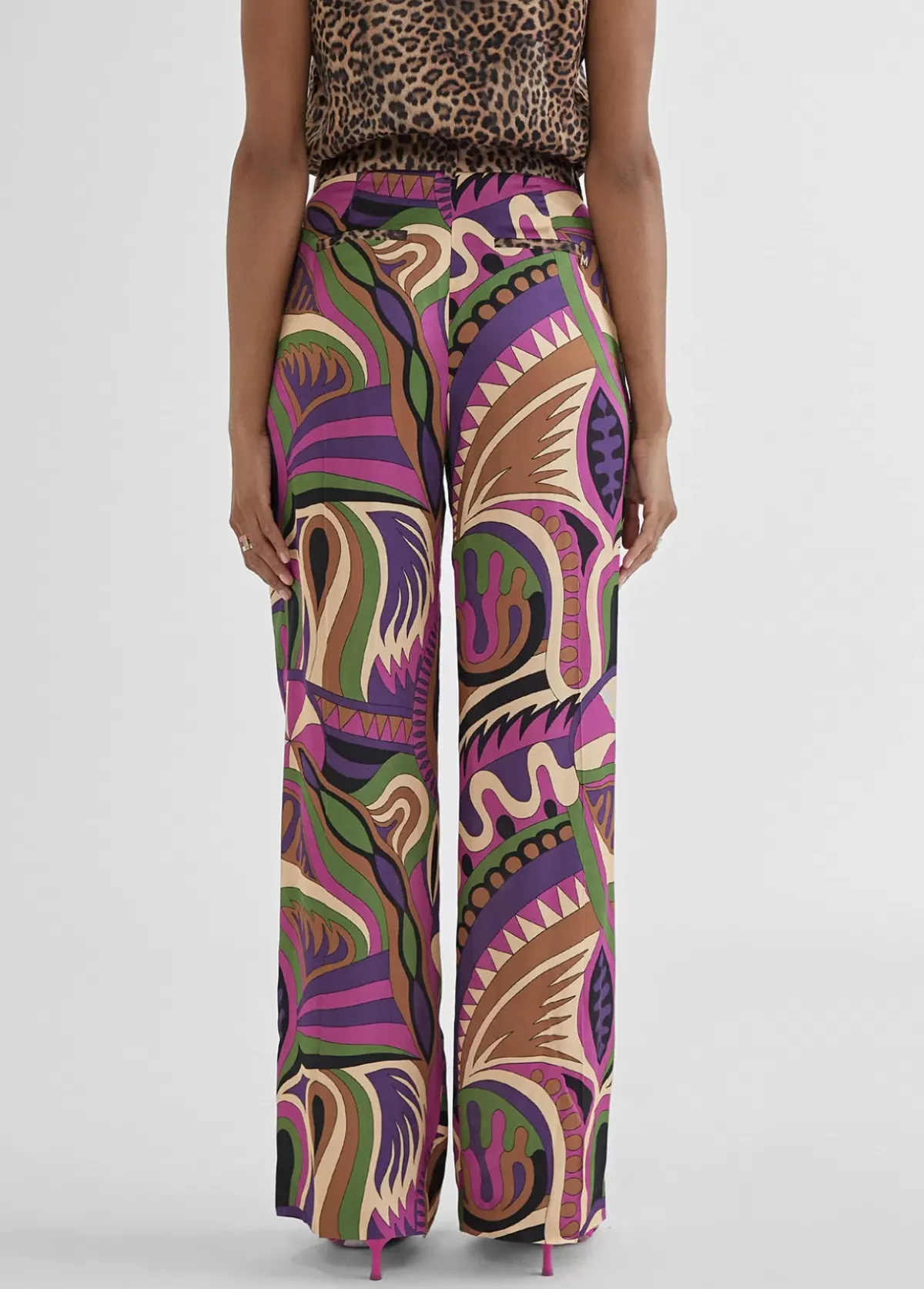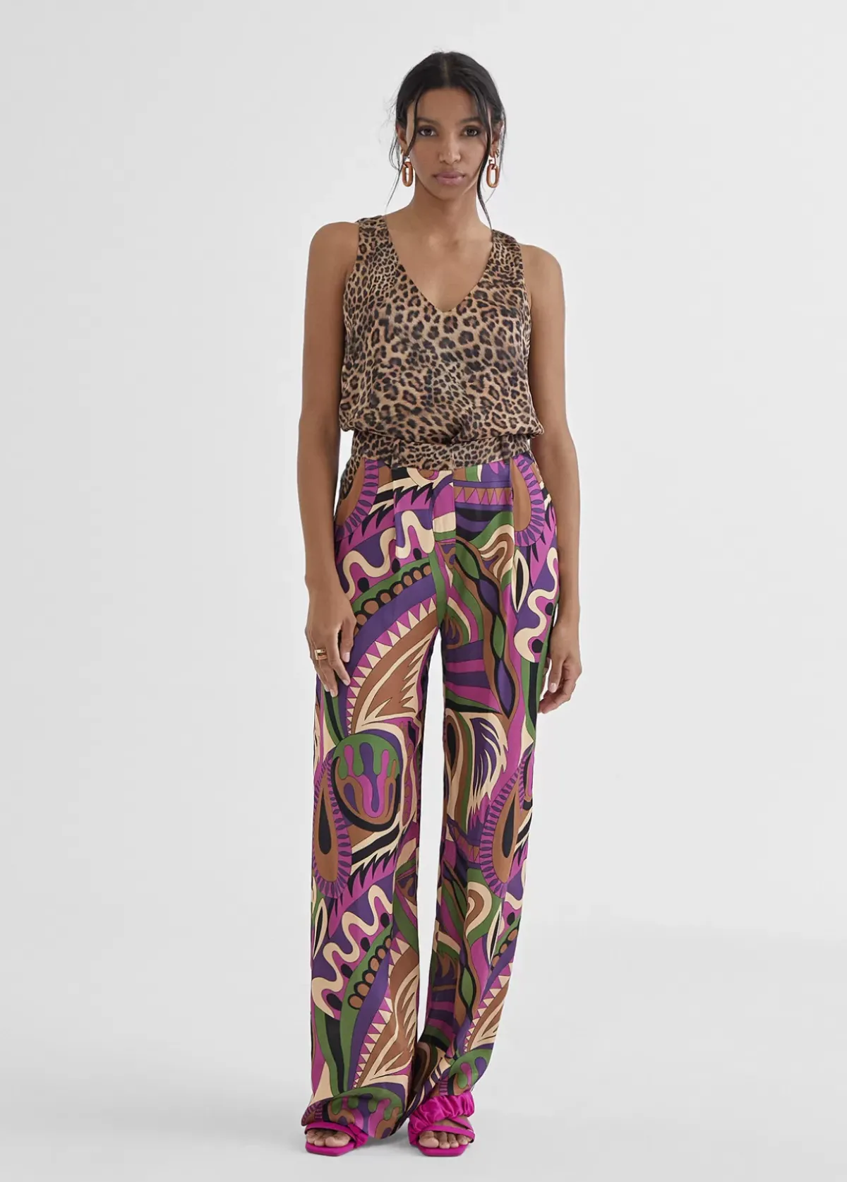 Pantalón palazzo fluido en estampado multicolor. Pinzas frontales y bolsillos laterales. Cinturilla en animal print. Cierre con cremallera y gancho metálico.