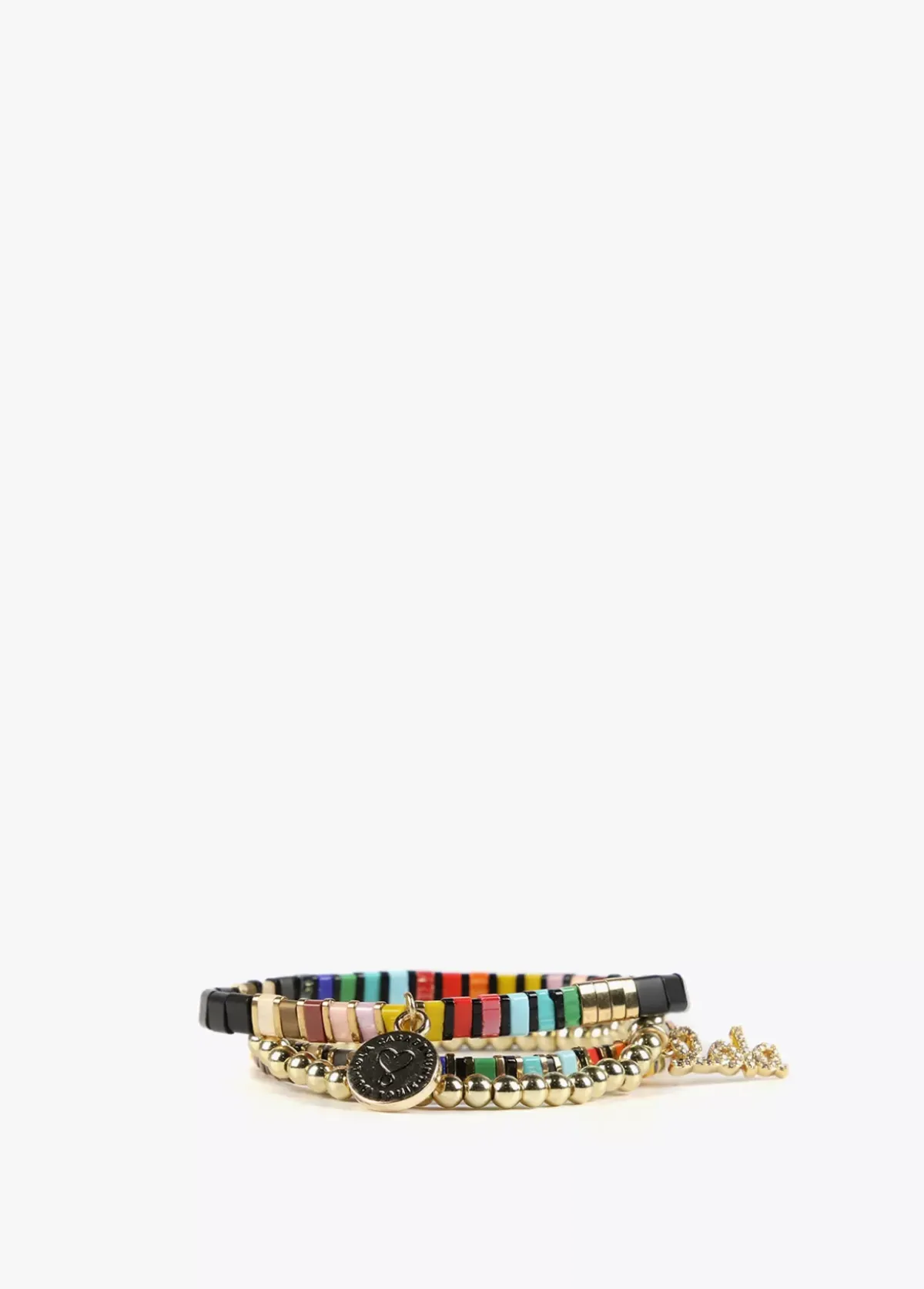 Set de pulseras elásticas multicolor con medallita logotipada.