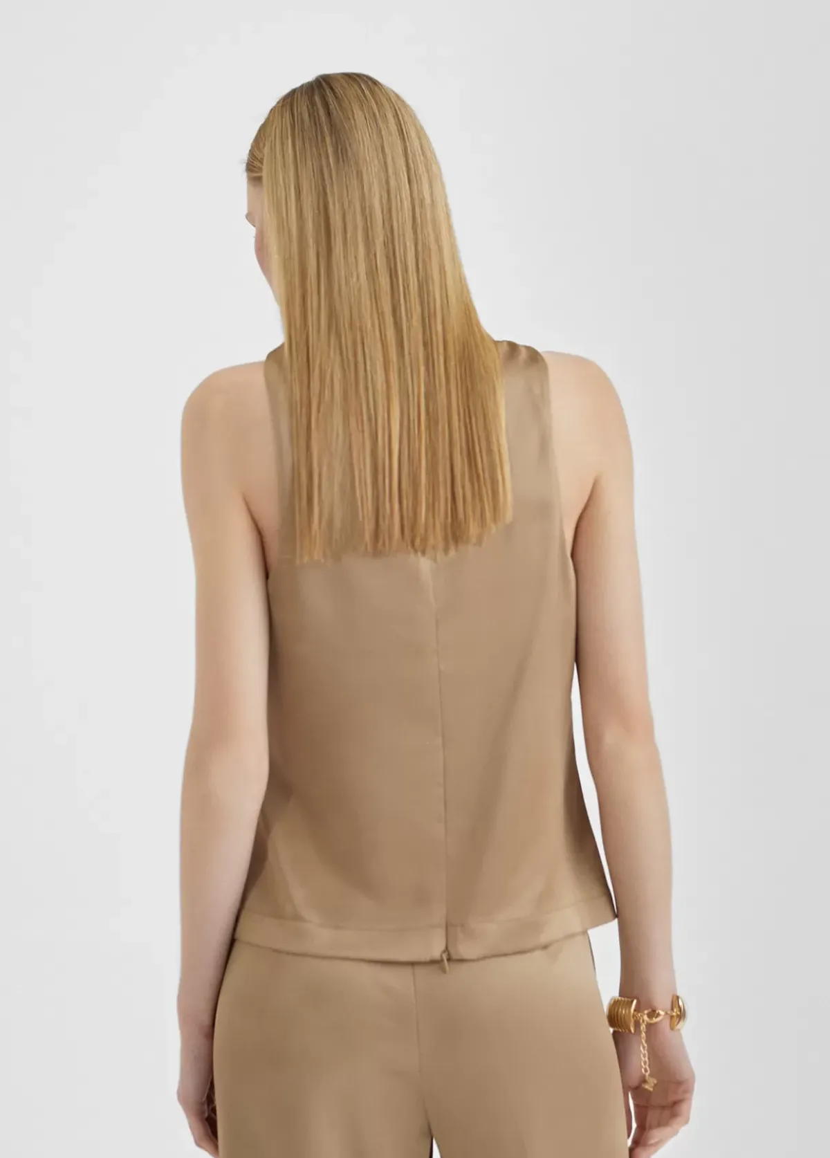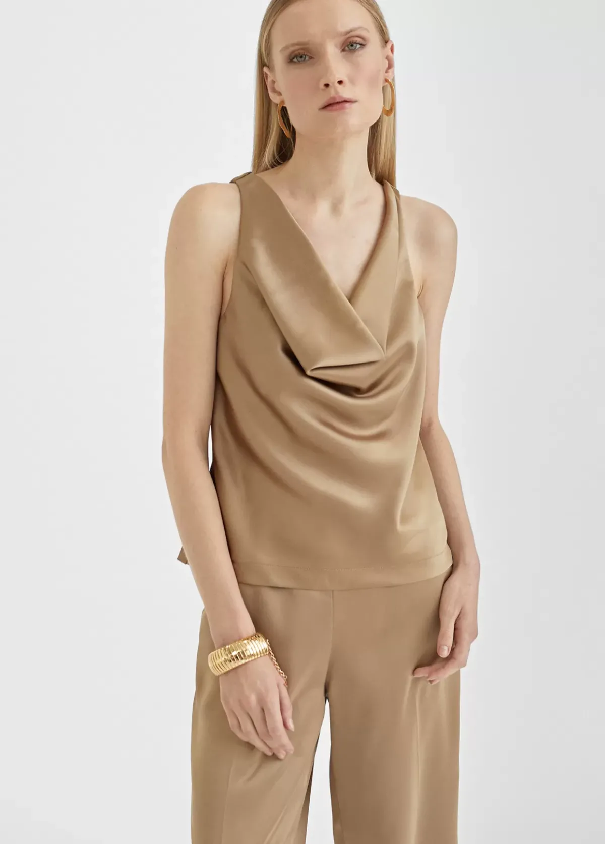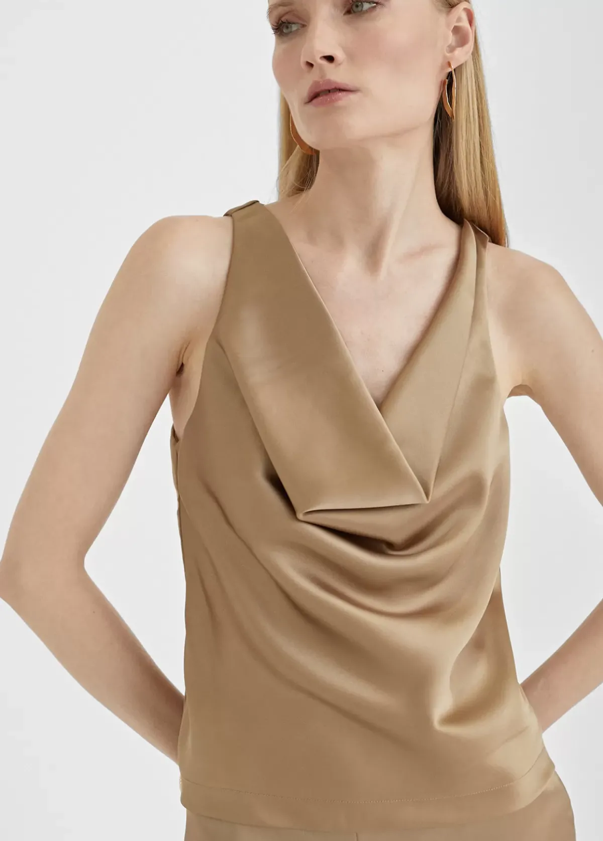 Top de tirante ancho. Efecto satinado y escote drapeado.