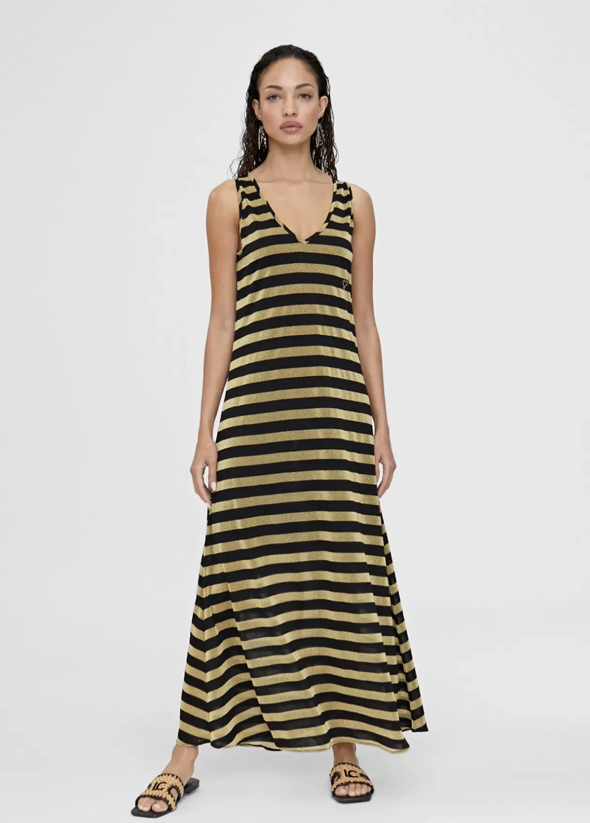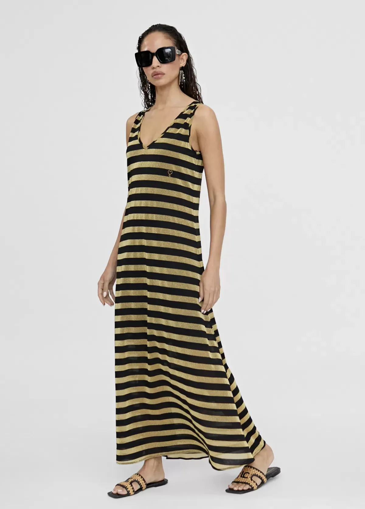 Vestido largo de rayas en punto. Escote pico y tirante sisa. Tejido en lúrex.