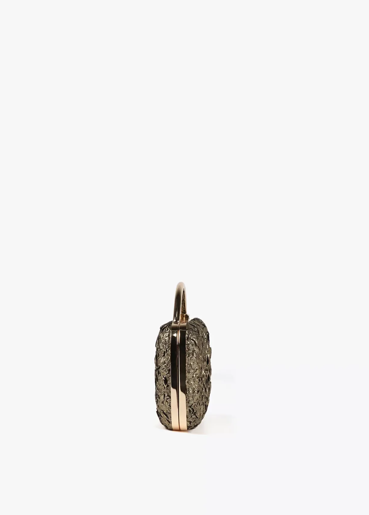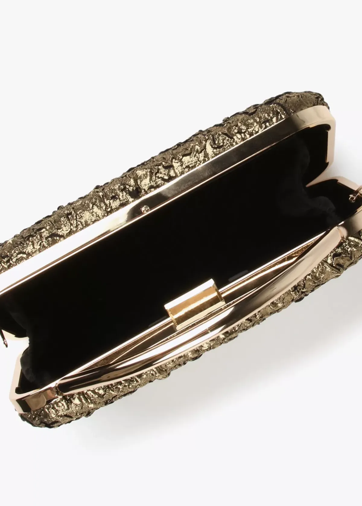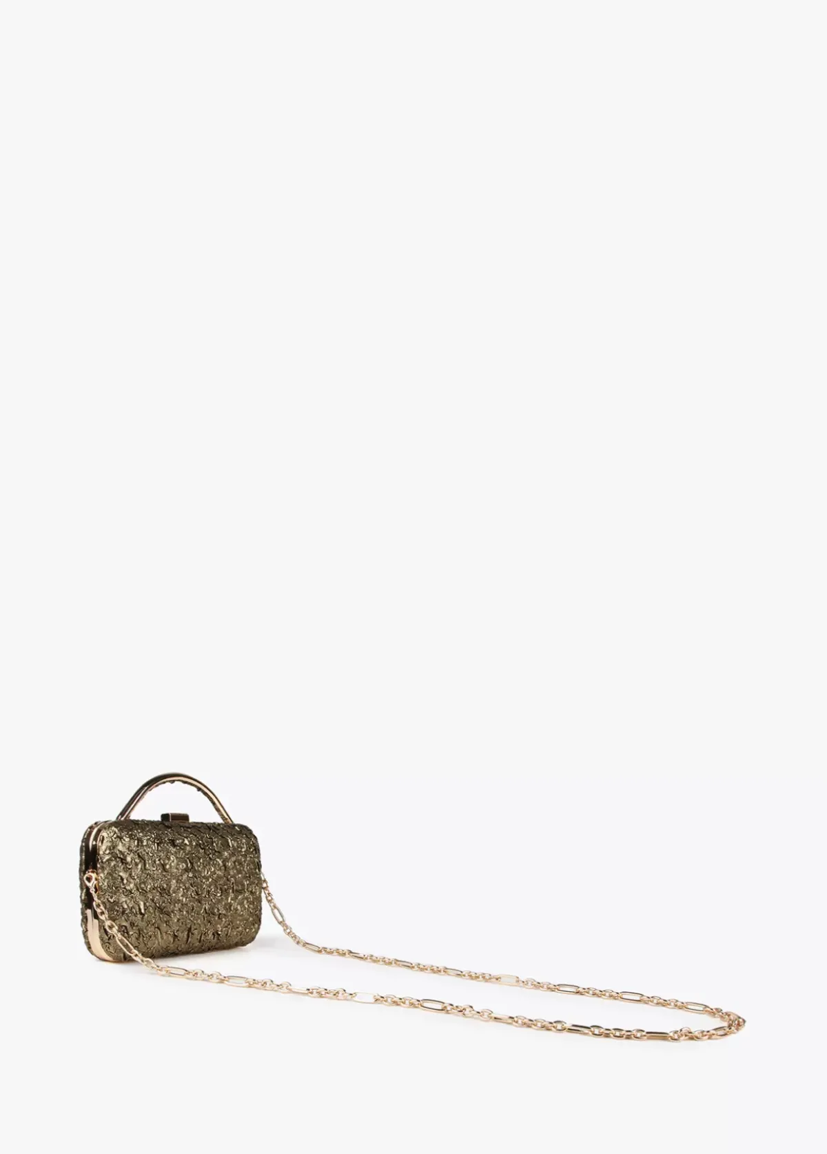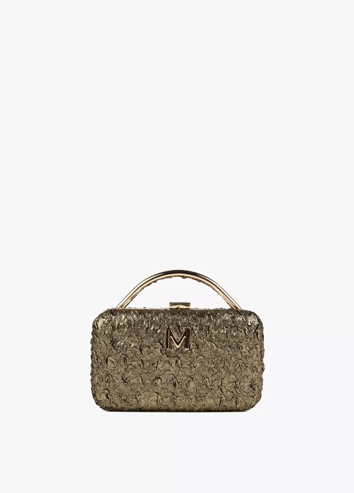 Bolsito fiesta tipo clutch en color dorado con detalle letra logo dorada en parte frontal. Asa bandolera de cadena extraíble.