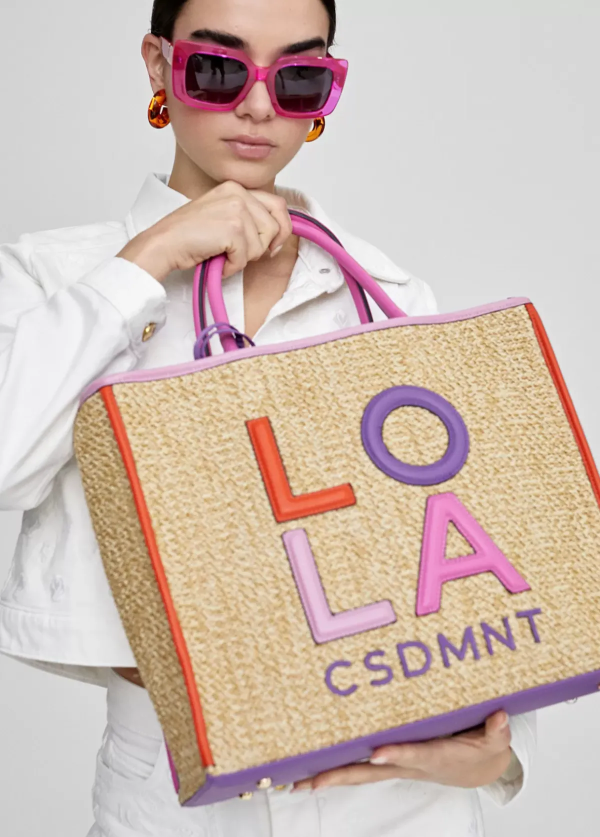 Bolso efecto rá¡fia con letras de color y ribetes a contraste. Cierre con saco interior protector.