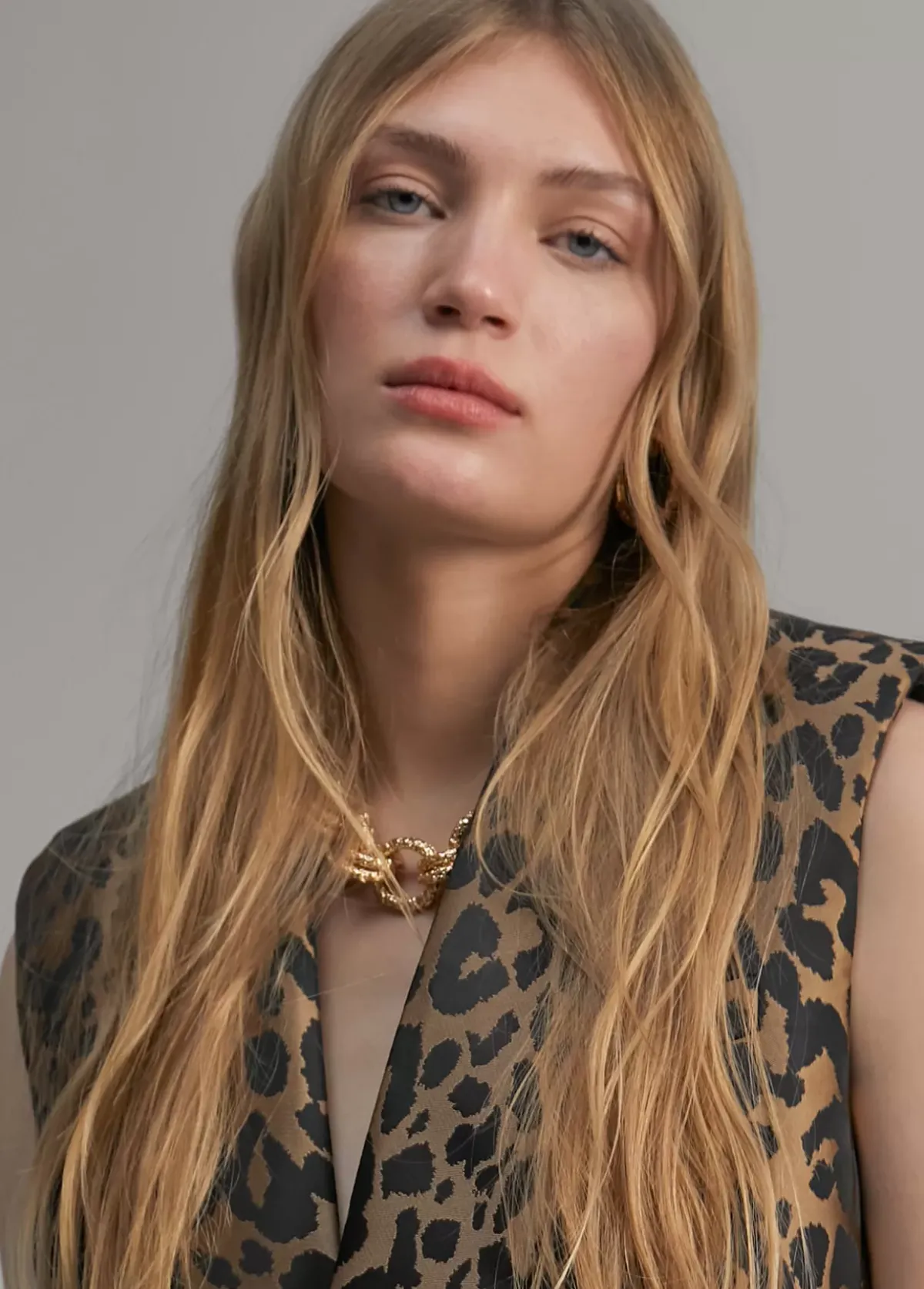 Chaleco recto en estampado animal print. Cuello solapa y hombreras. Botones centrales y tapetes laterales.