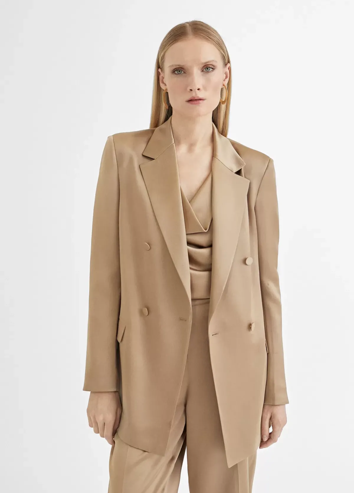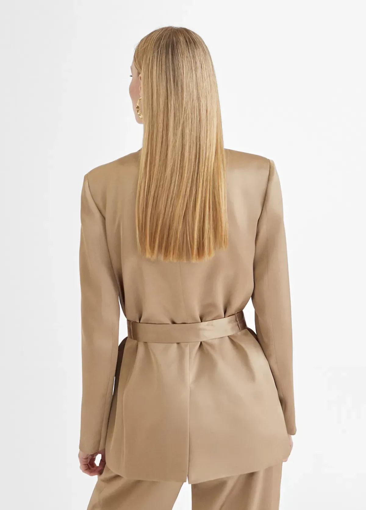 Americana tipo blazer cruzado satinado. Cuello solapa. Botones y cinturón forrados del mismo tejido. Bolsillos de vivo con solapa en delantero.