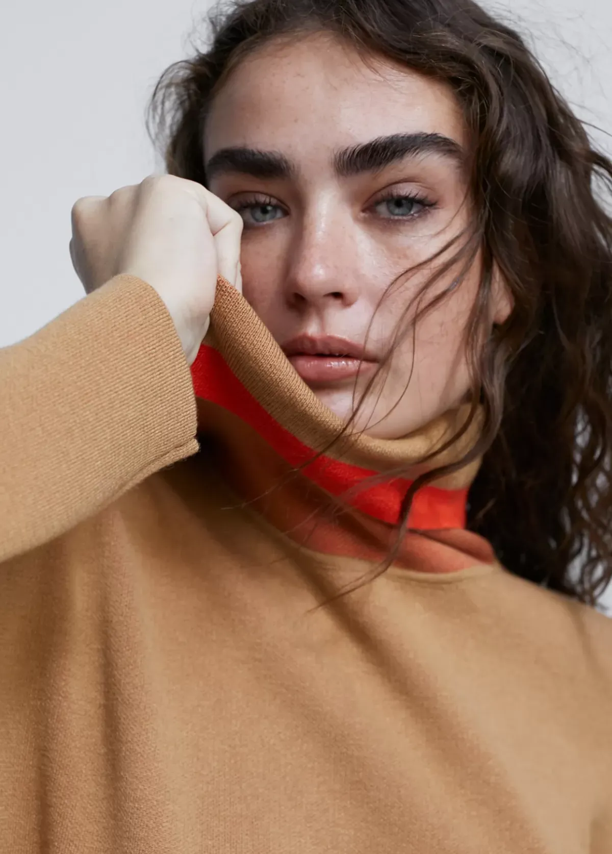Jersey ancho de punto y de cuello alto. Detalle de color en laterales, manga y cuello.