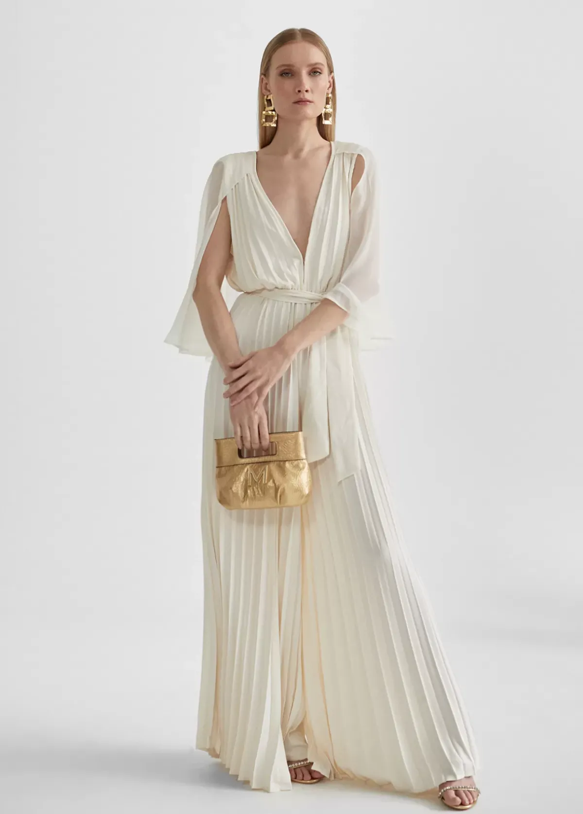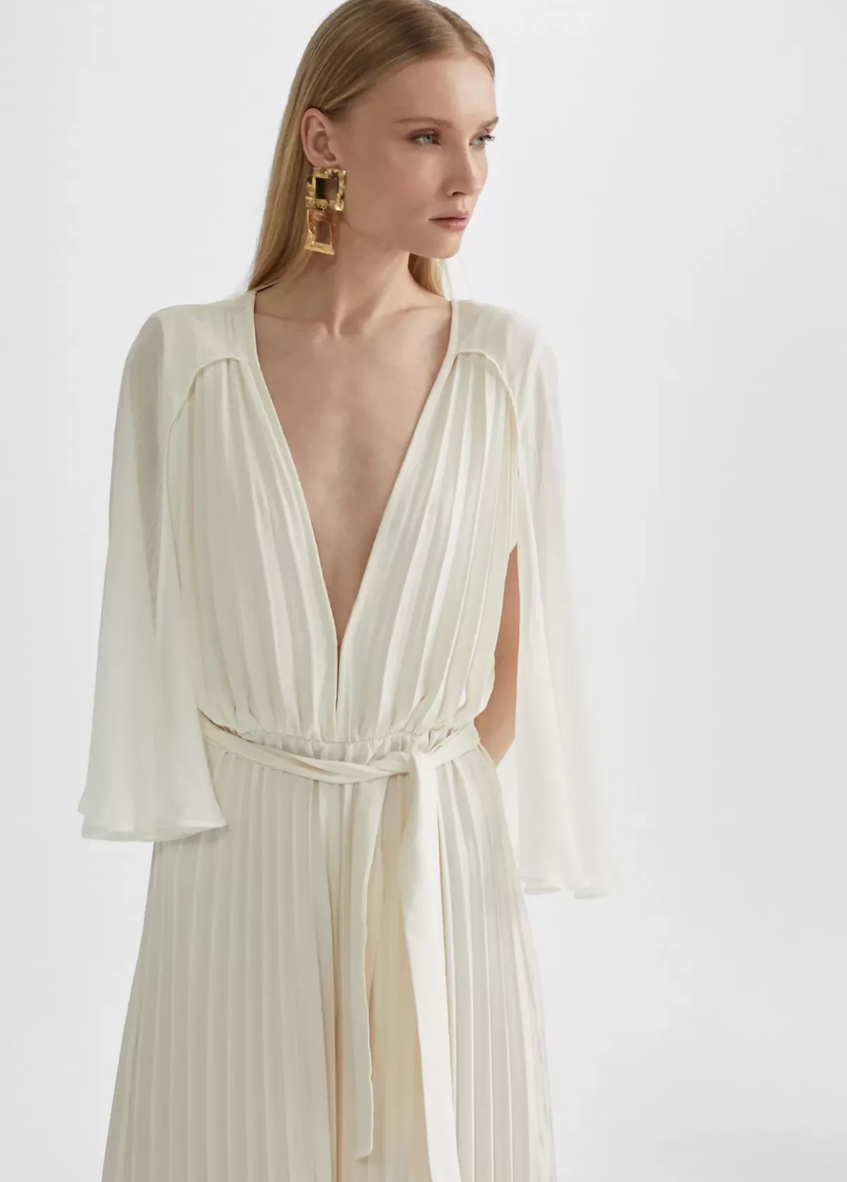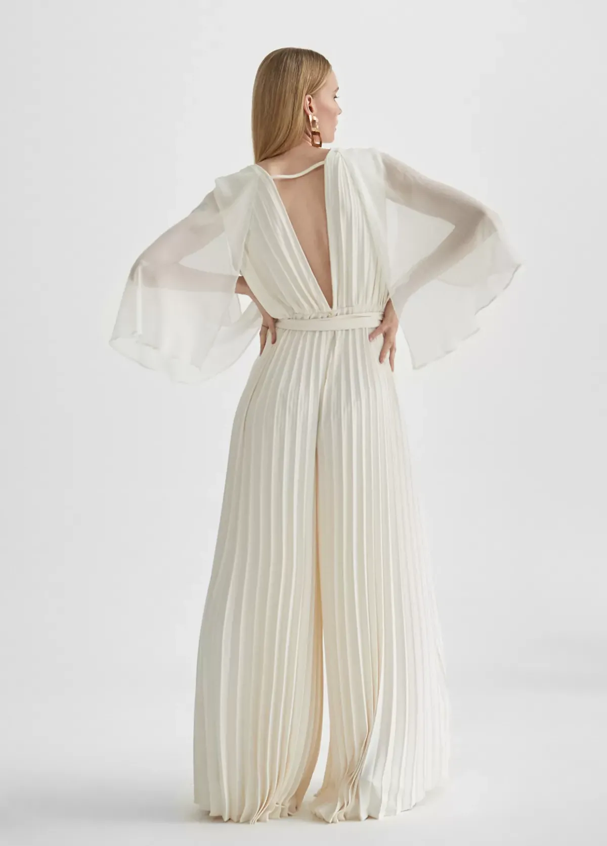 Mono largo plisado de tejido fluido. Escote pico en frontal y espalda. Cinturilla elástica. Mangas efecto capa. Cinturón del mismo tejido y color.
