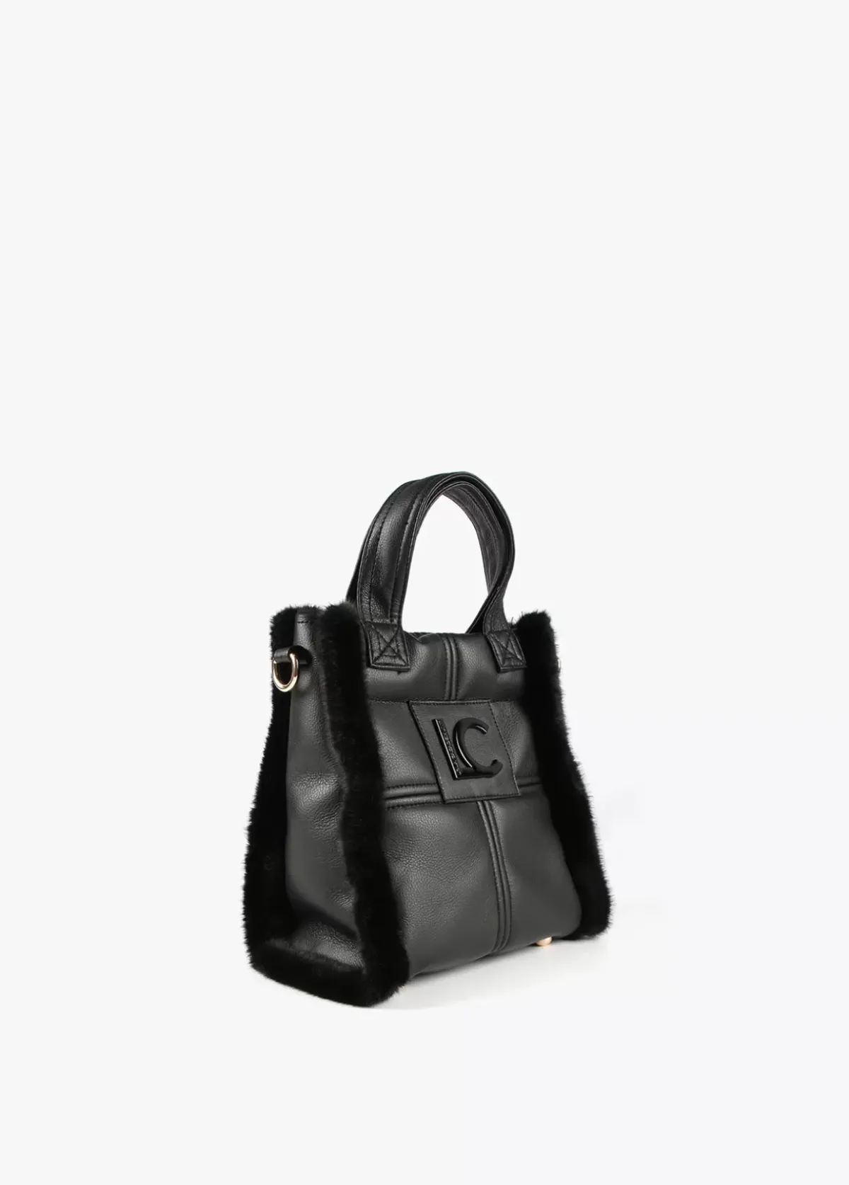 Bolso tipo bandolera en efecto piel y efecto pelo combinados. Asas de mano y asa bandolera ajustable y extraíble. Cierre con botón imantado y logo lacado en parte frontal.