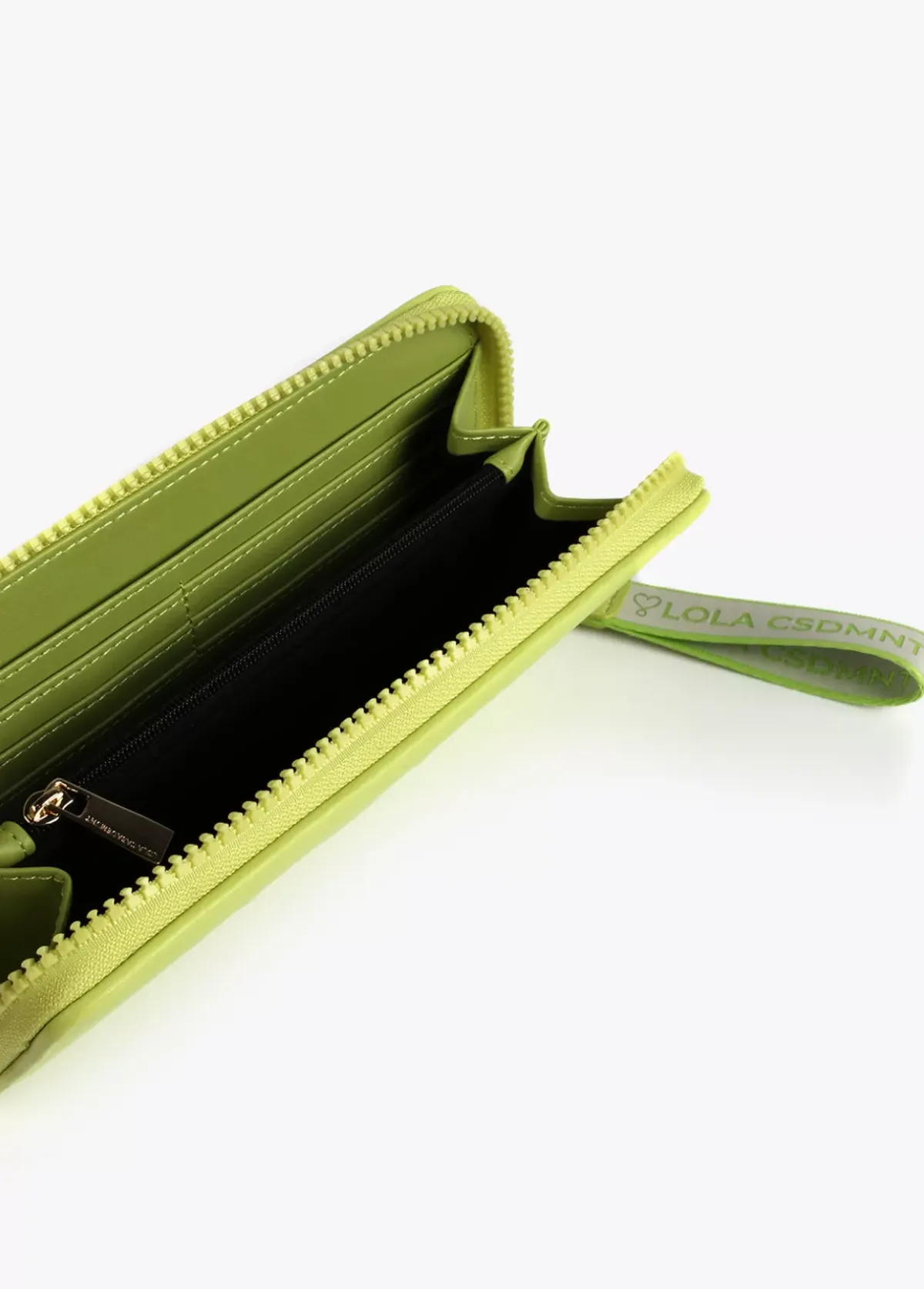 Billetero grande en efecto piel y logo en relieve. Asa de mano logotipada, cierre de cremallera y logo lacado en parte frontal.