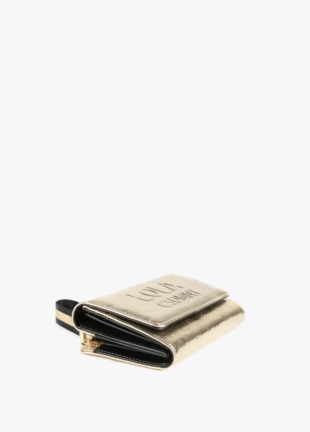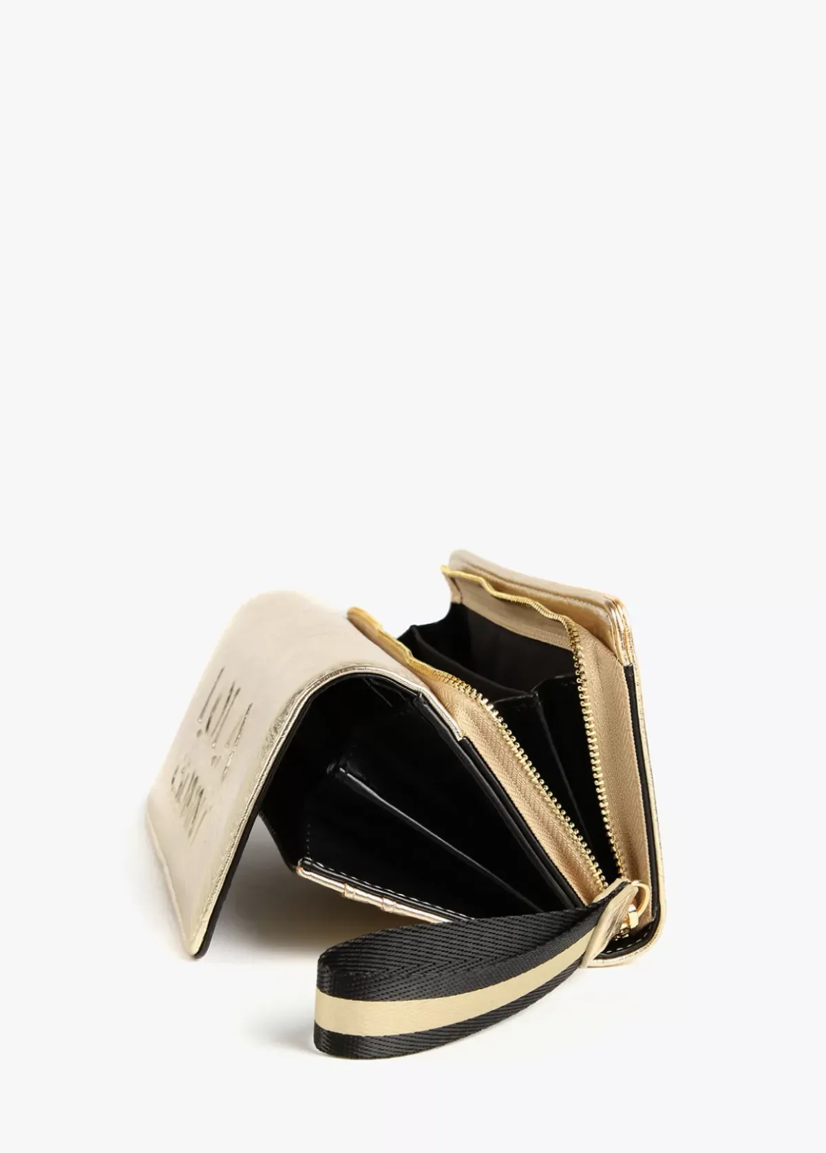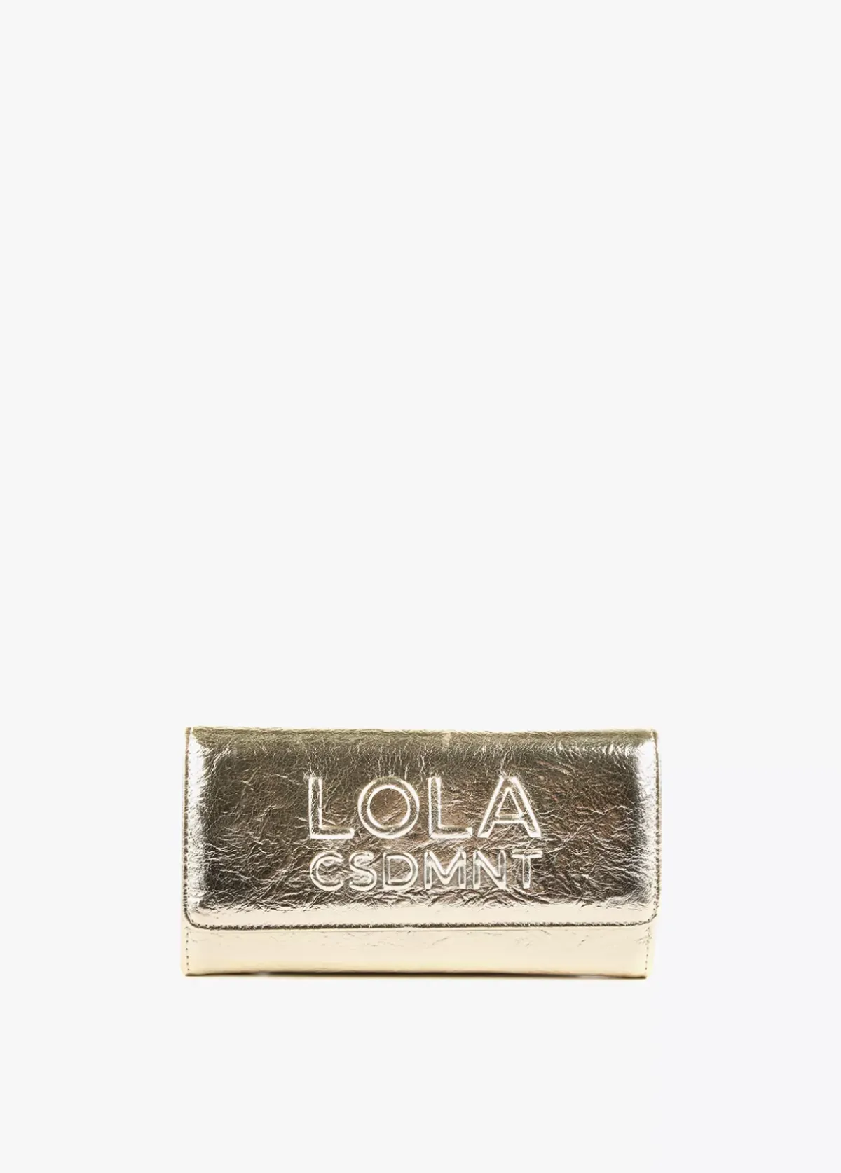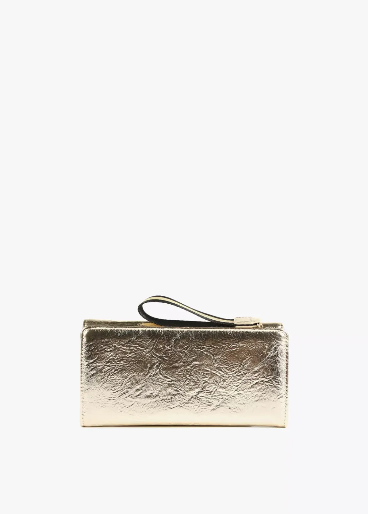 Billetero grande metalizado con logo grabado en parte frontal. Cierre con cremallera y botón clic. Detalle asa de mano.