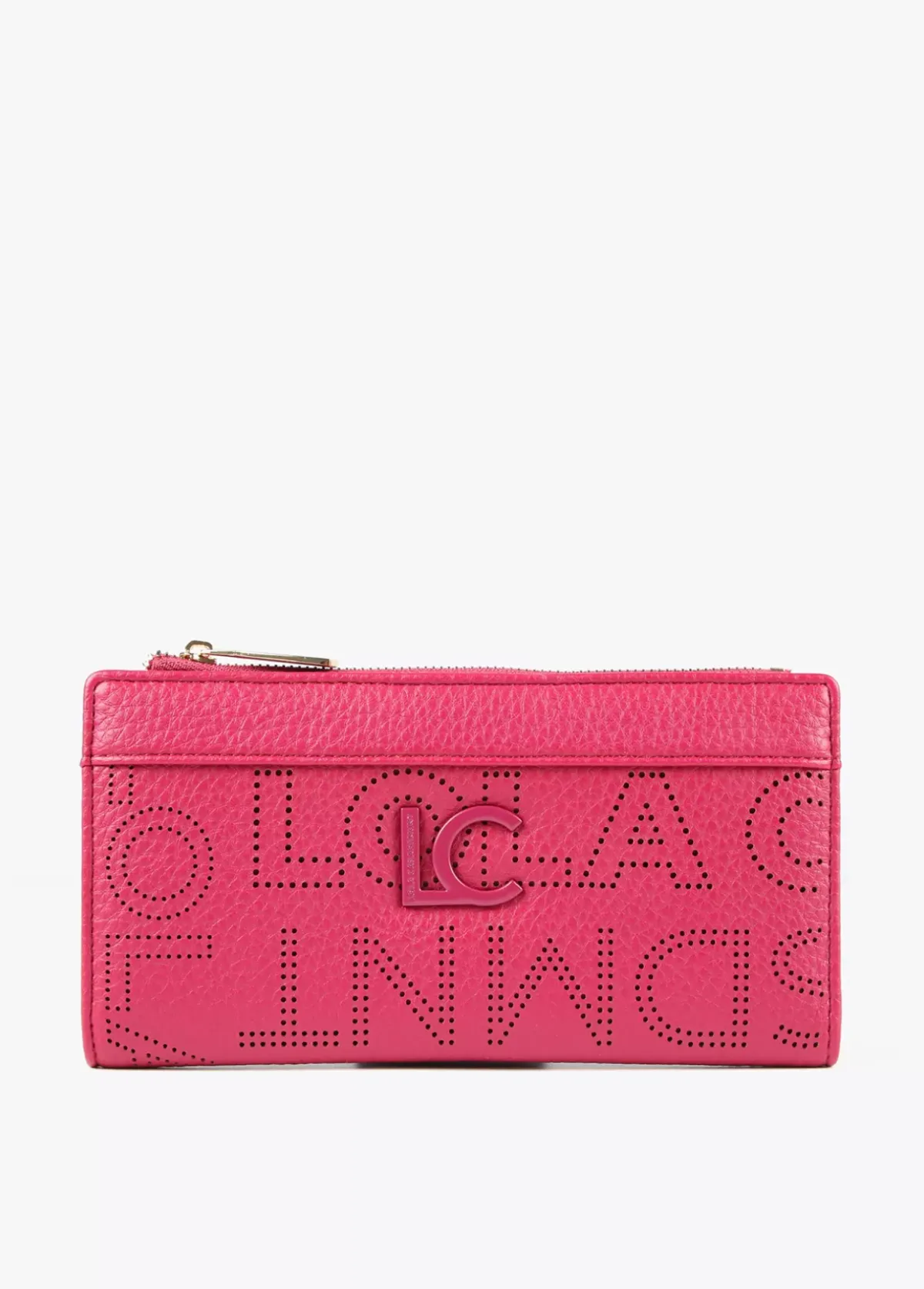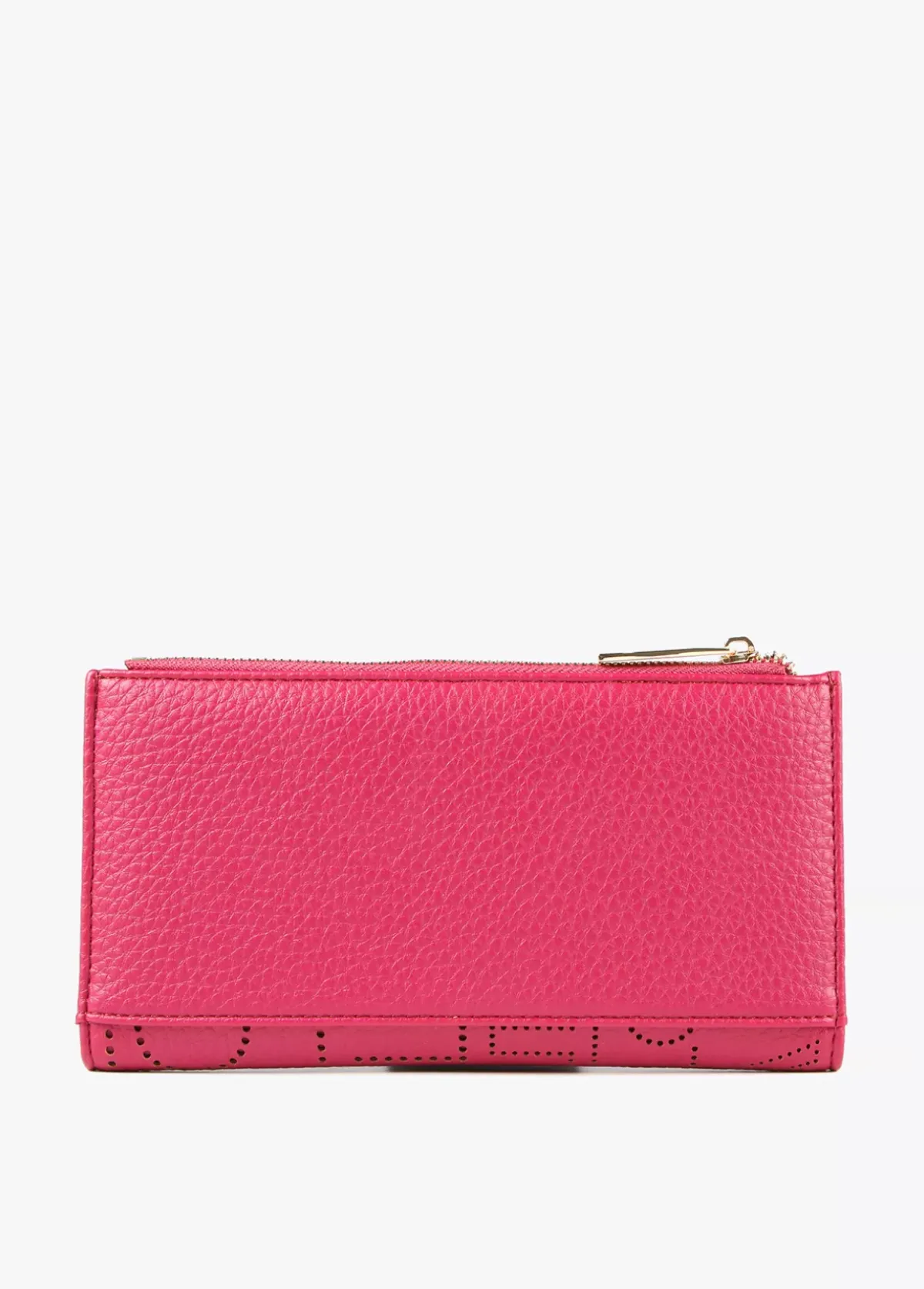 Billetero grande con logotipo troquelado. Cierre con cremallera en monedero y cierre con botón clic en zona tarjetero.