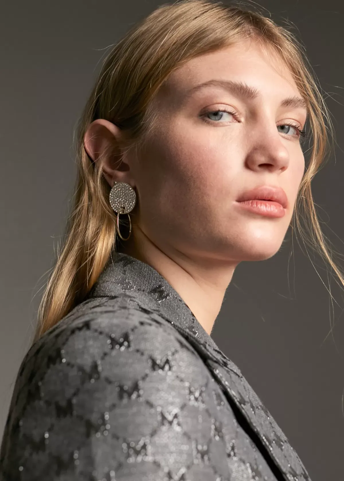 Blazer jacquard en monograma M bicolor en lúrex. Cuello solapa y cruzada con botones. Tapete de bolsillos en laterales.