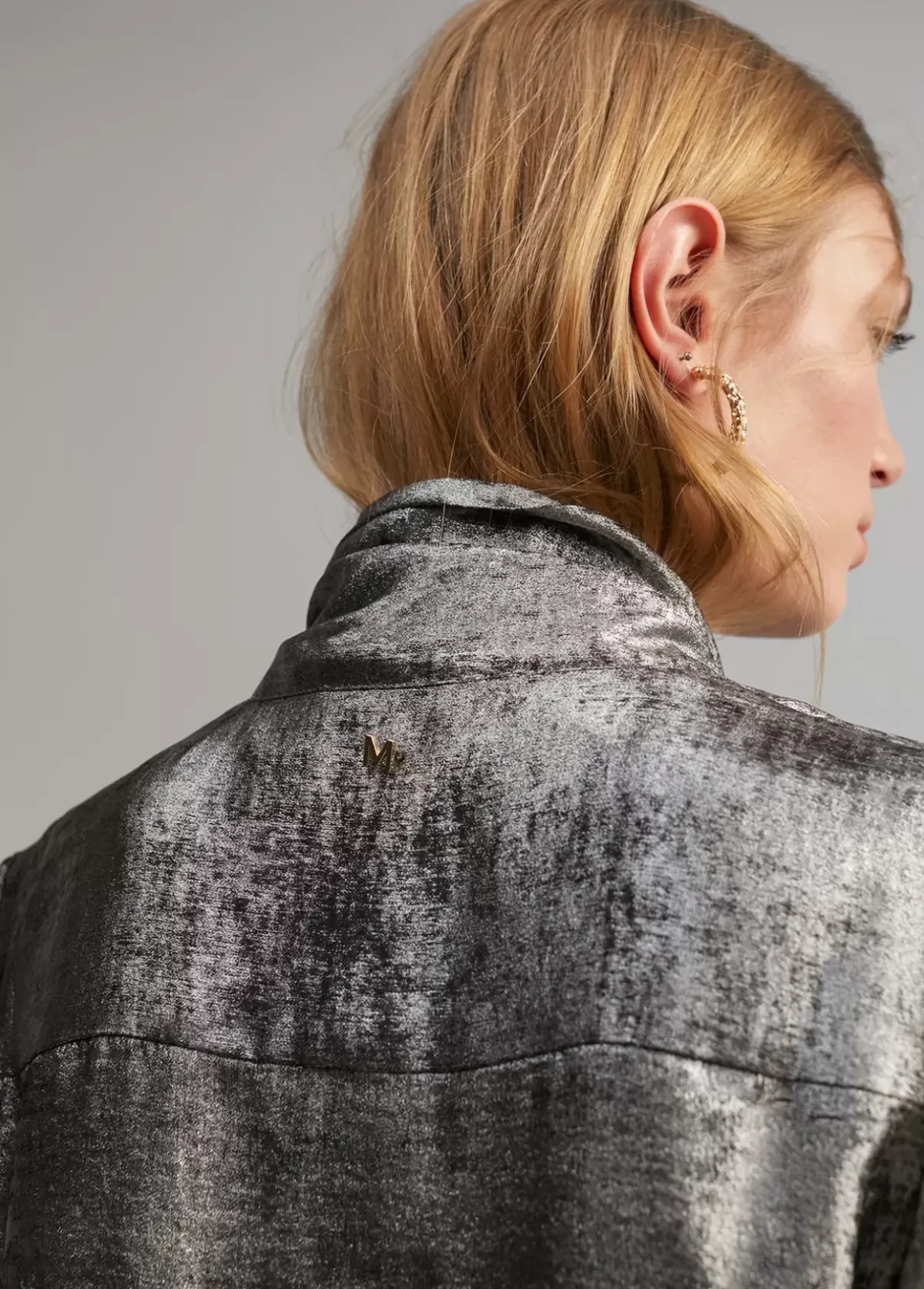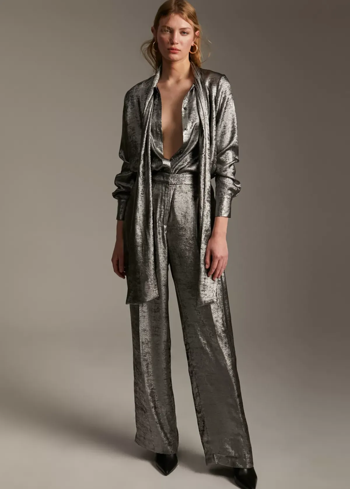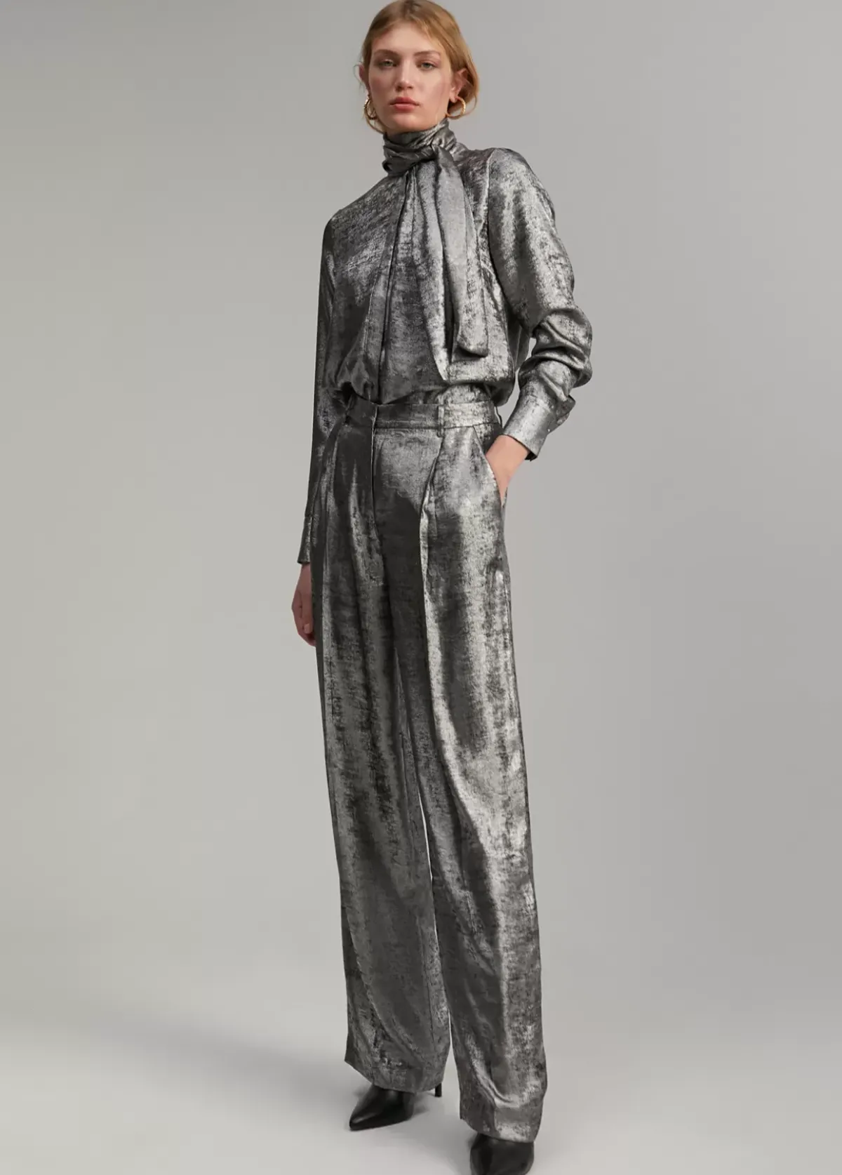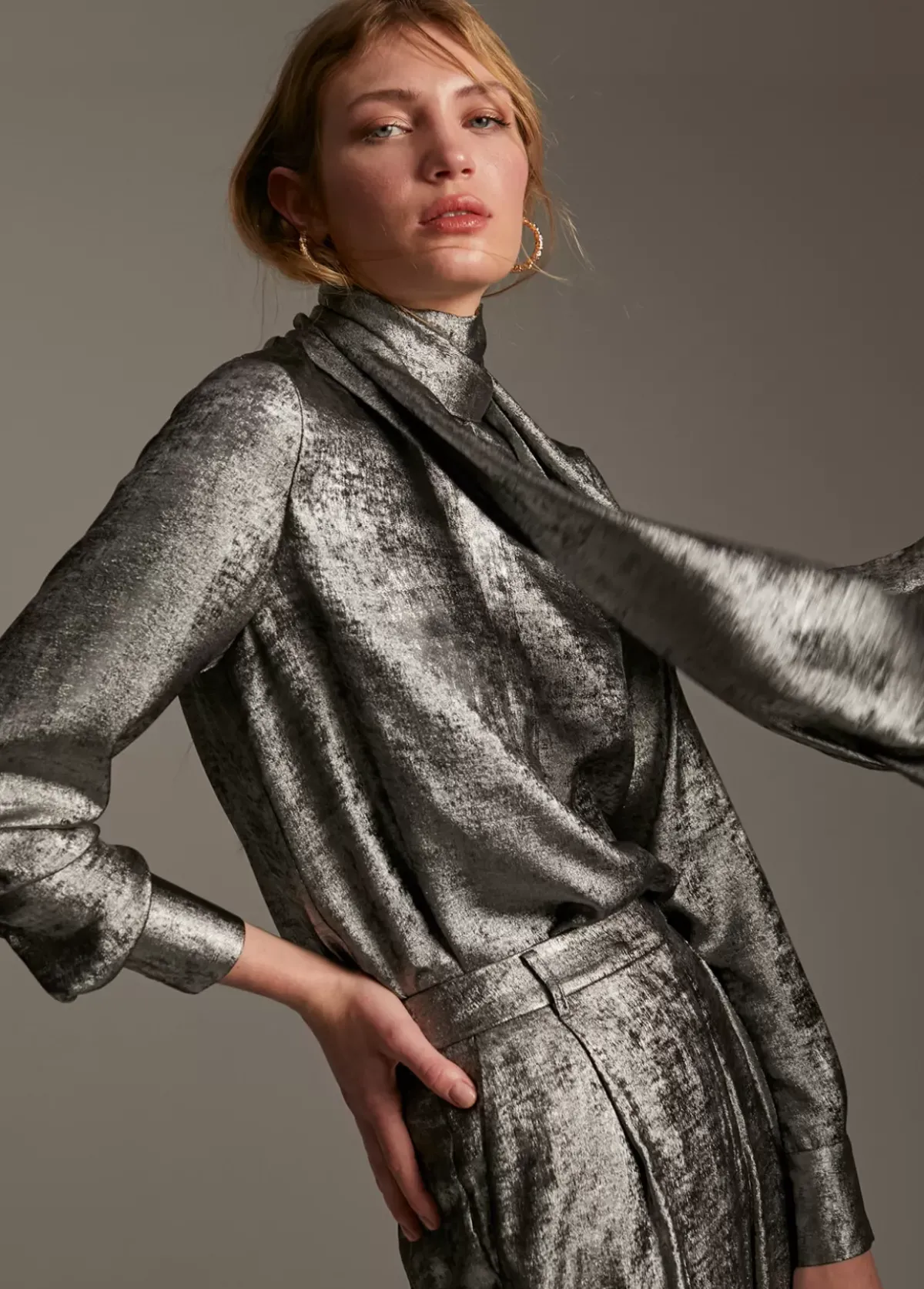 Blusa con efecto laminado. Lazada en cuello del mismo tejido. Puños camiseros. Cerrada con botones bajo tapete.