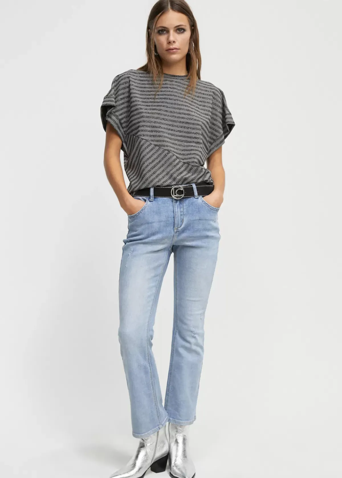 Camiseta de cuello caja y manga sisa de rayas bicolor bidireccionales con hilatura de lúrex.