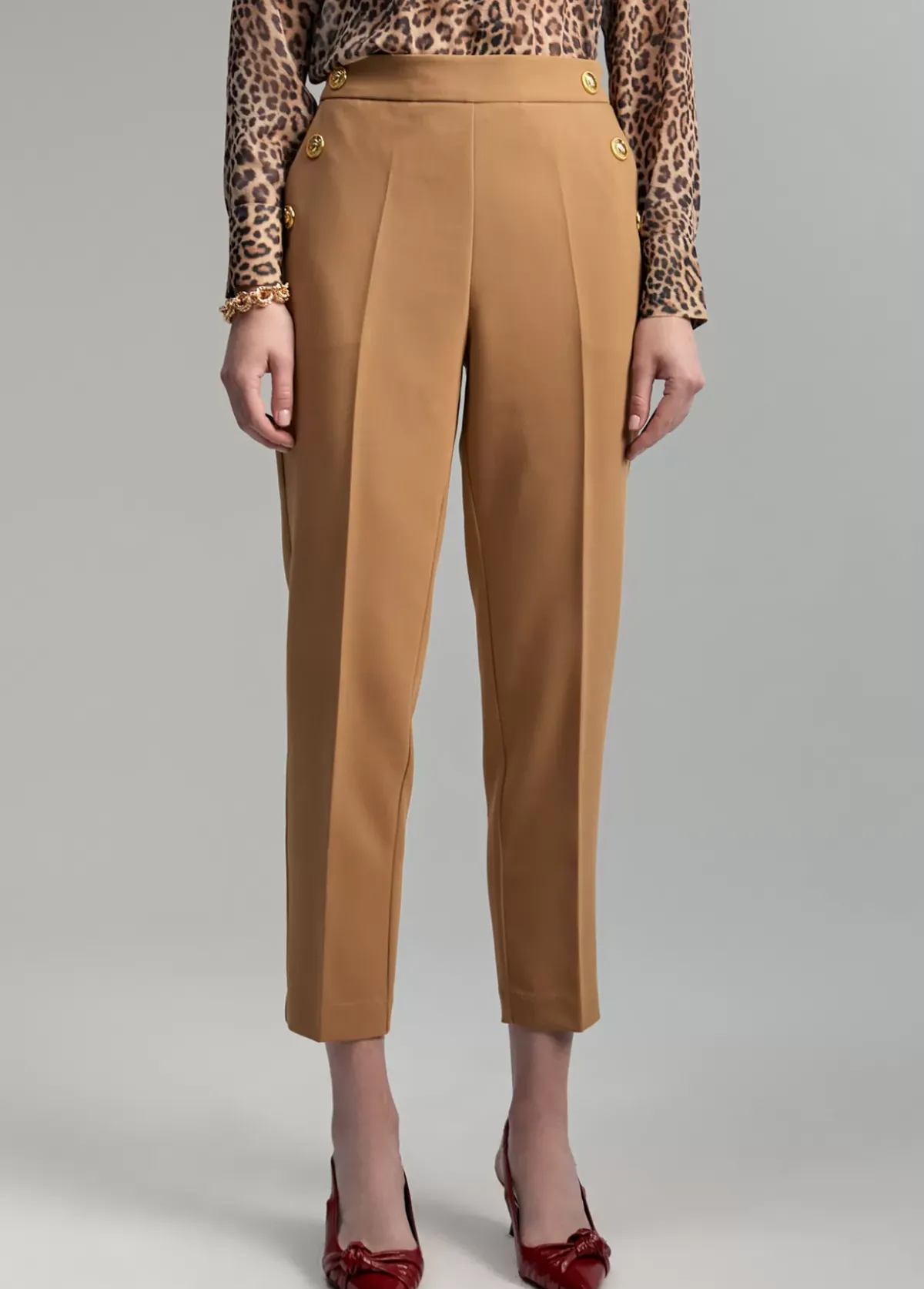 Pantalón de largo tobillero. Bolsillos laterales con detalle de botones metálicos en dorado. Goma trasera y falso bolsillo con vivo.