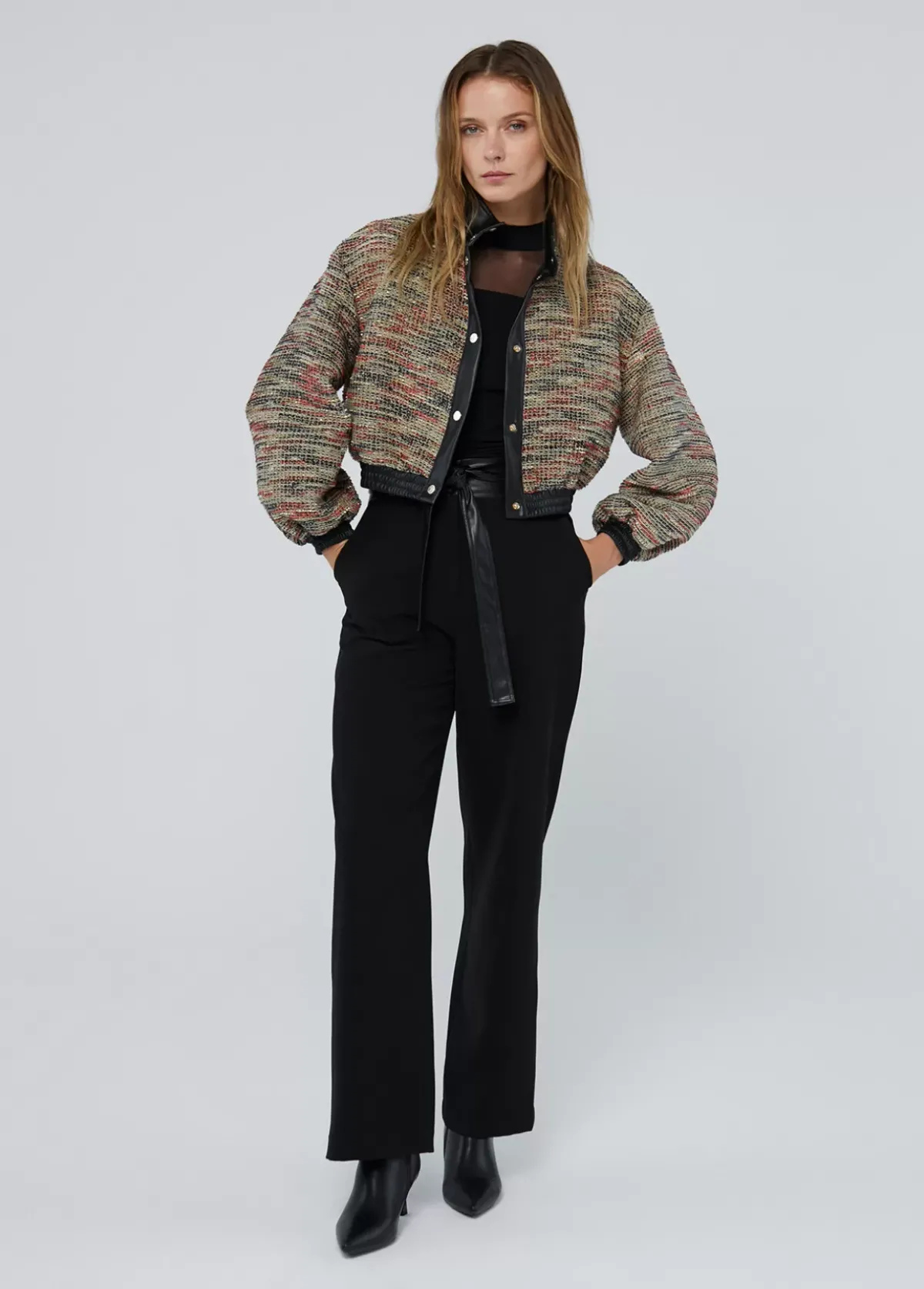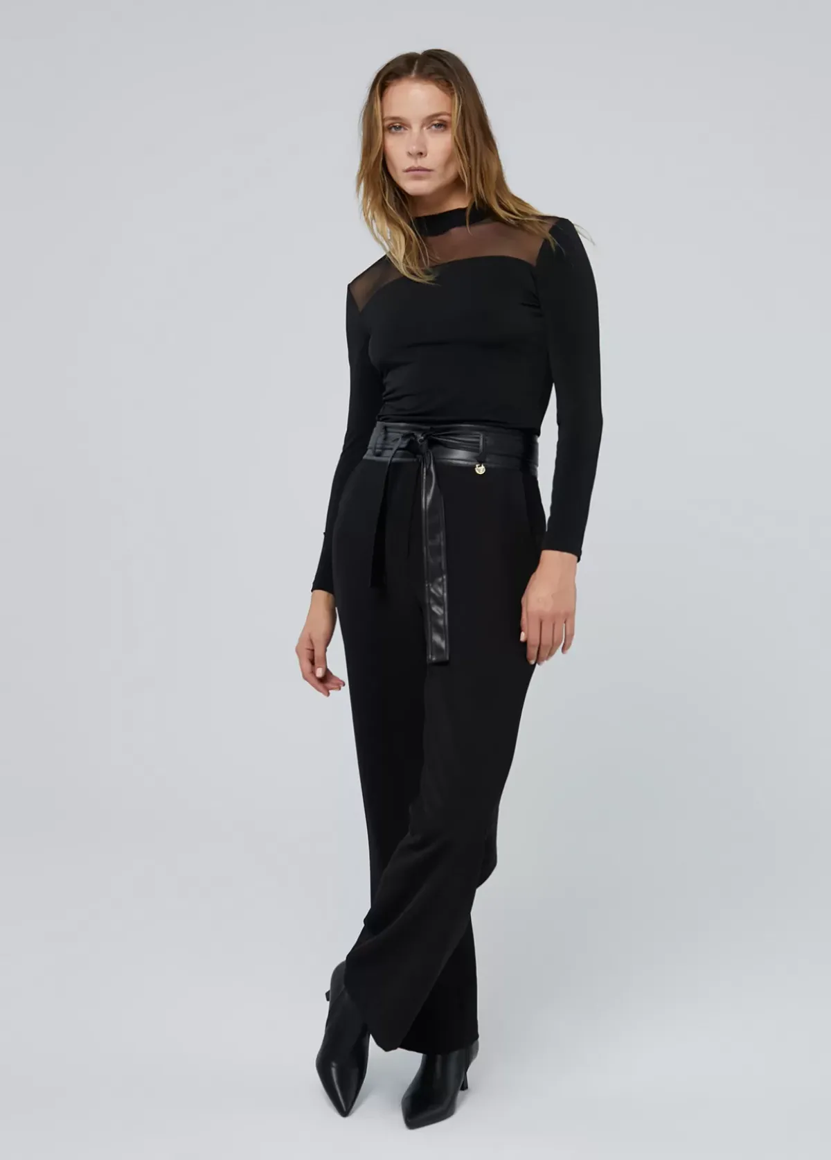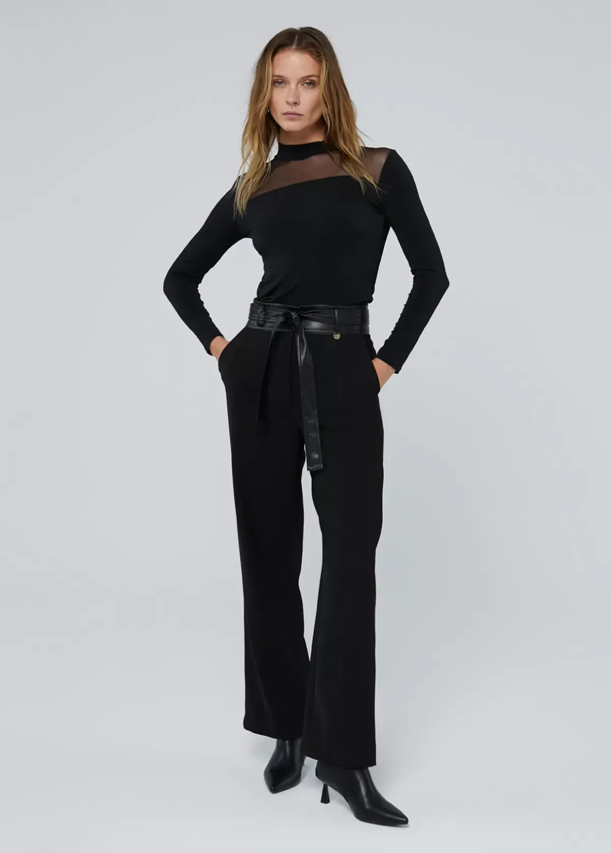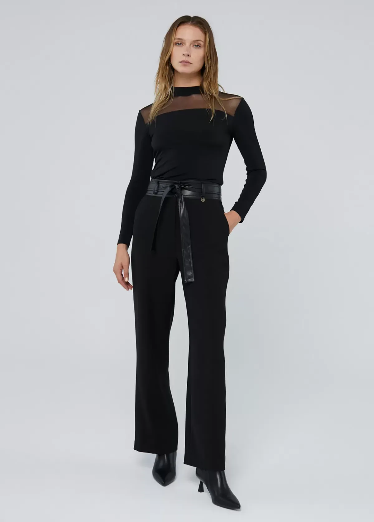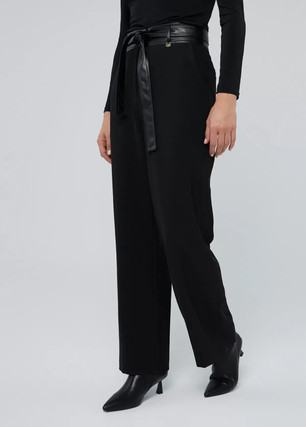 Pantalón recto. Detalle de cinturón en efecto piel a tono. Bolsillos laterales. Cierre con cremallera frontal.