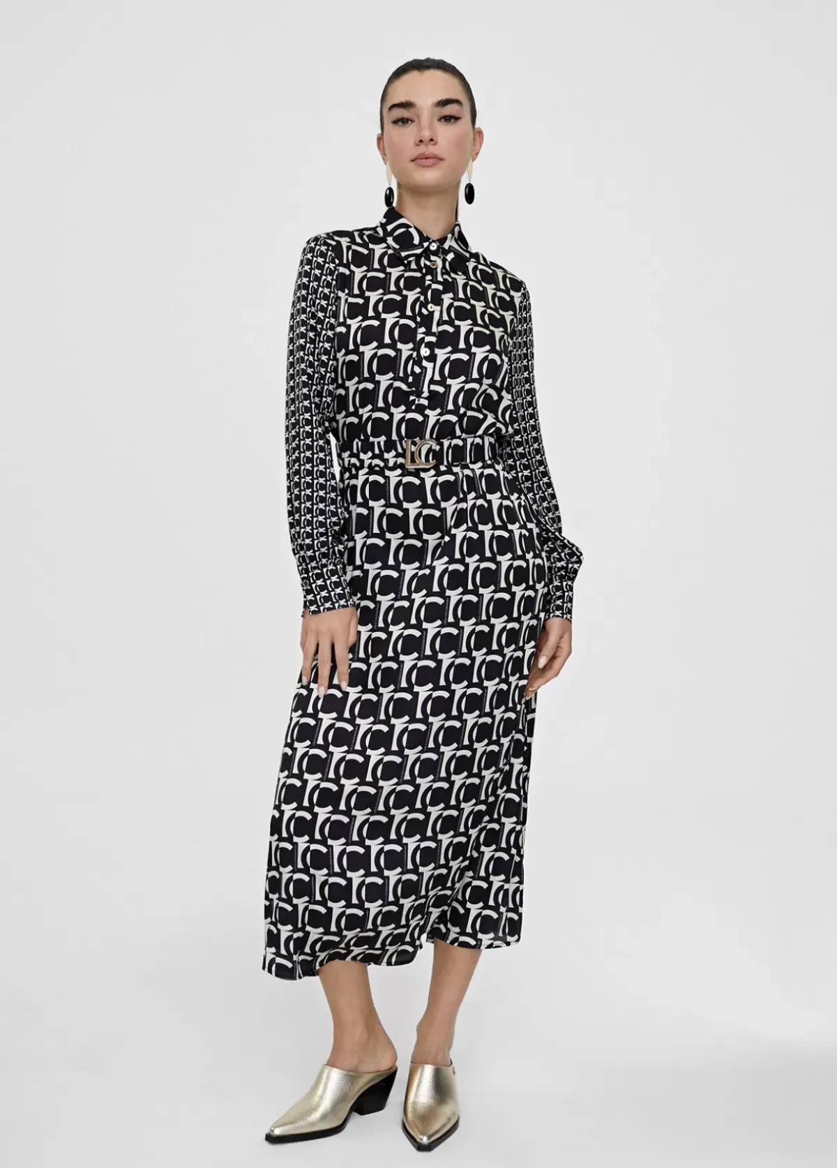 Vestido camisero, monograma. De tejido fluido y largo midi. Frontal maxi logo y mangas en mini logo. Cuello polo con botones dorados y puños camiseros. Cinturón elástico con hebilla metálica y largo midi.