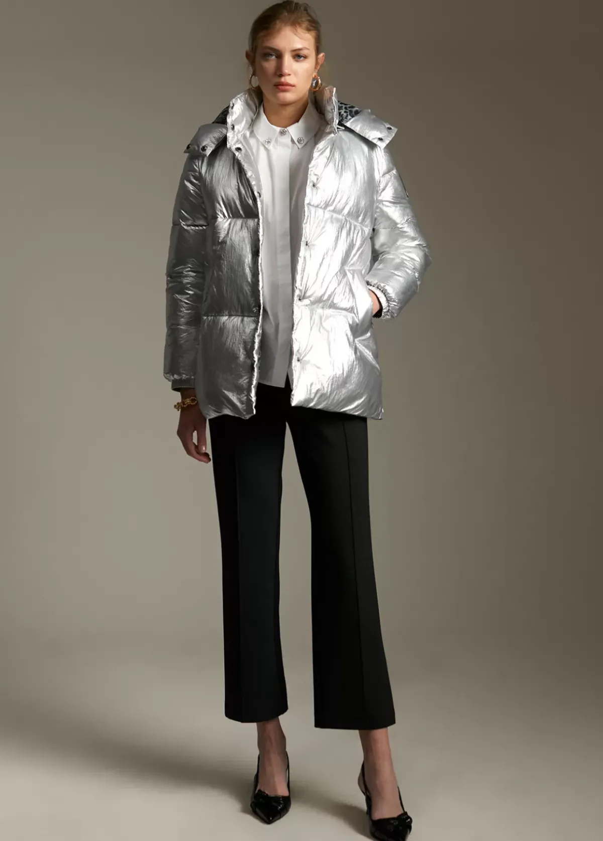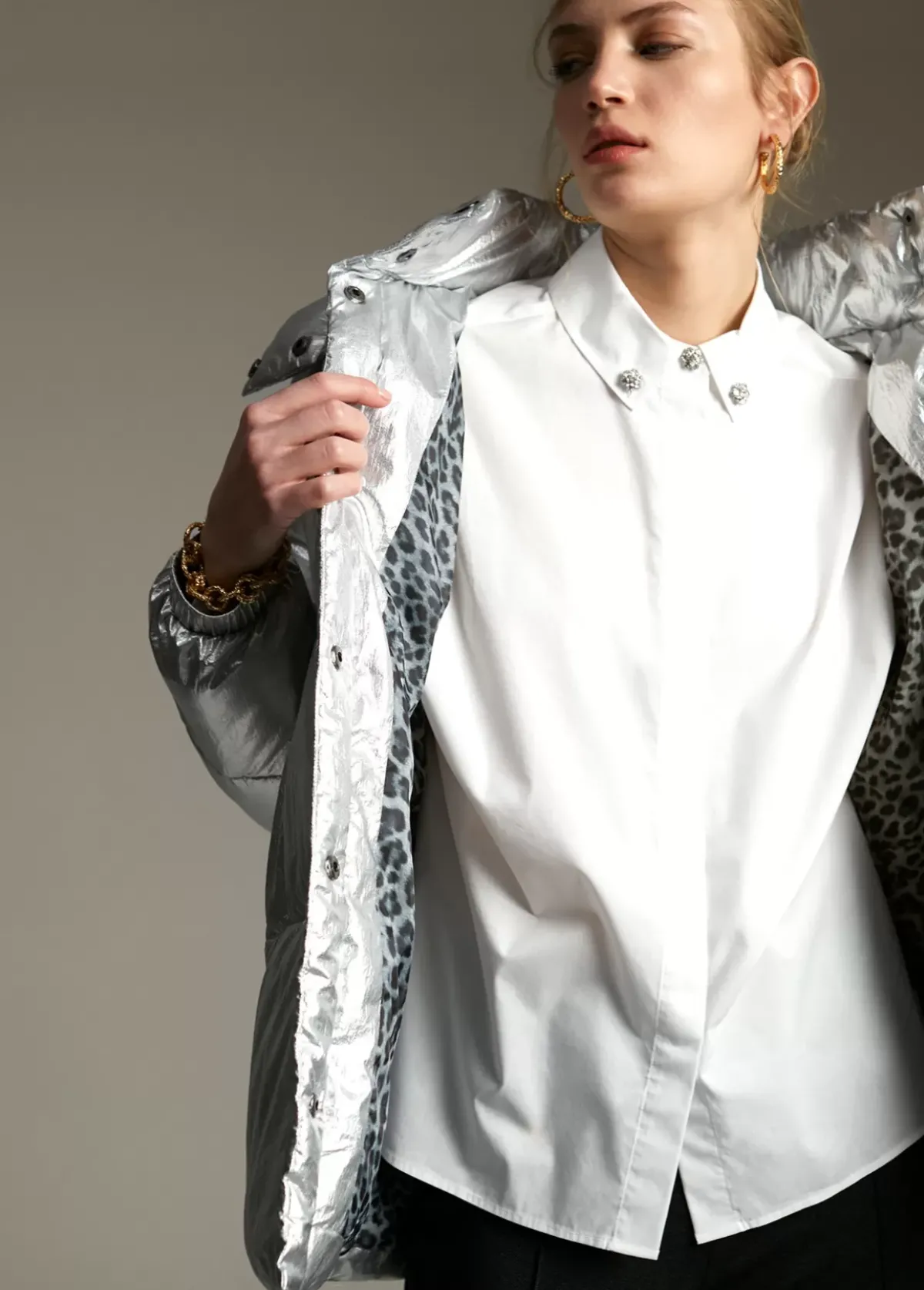 Anorak acolchado metalizado y con capucha extraíble. Forro en animal print a tono. Cerrado con snaps metálicos y bolsillos laterales. Puños elásticos.