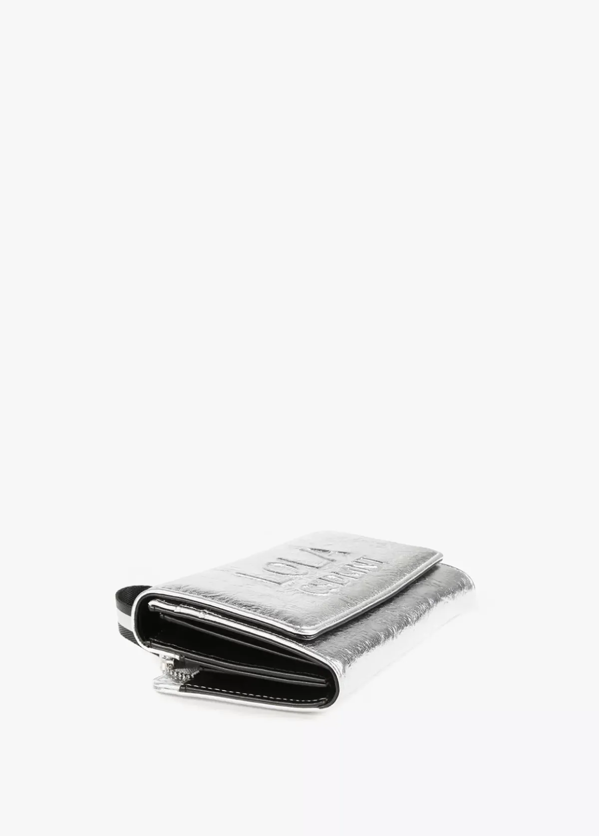 Billetero grande metalizado con logo grabado en parte frontal. Cierre con cremallera y botón clic. Detalle asa de mano.