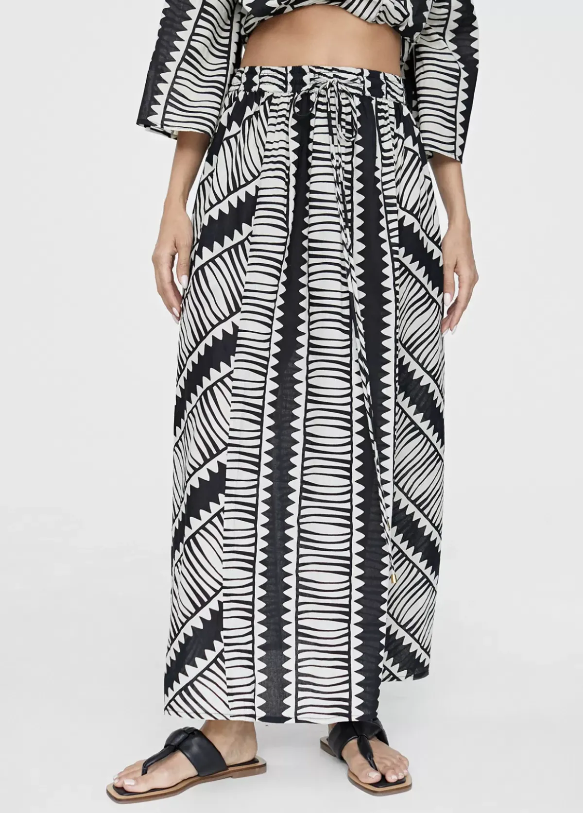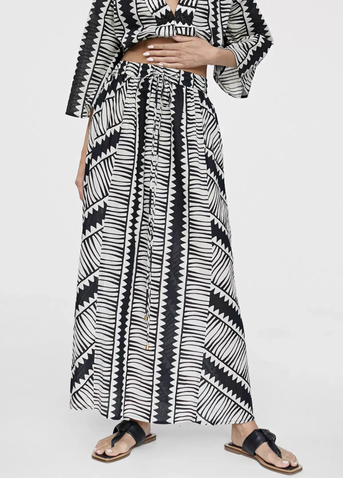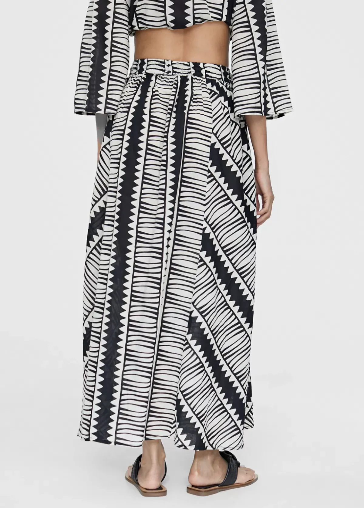 Falda de largo midi en estampado étnico bicolor. Cintura elástica ajustable. Bolsillos