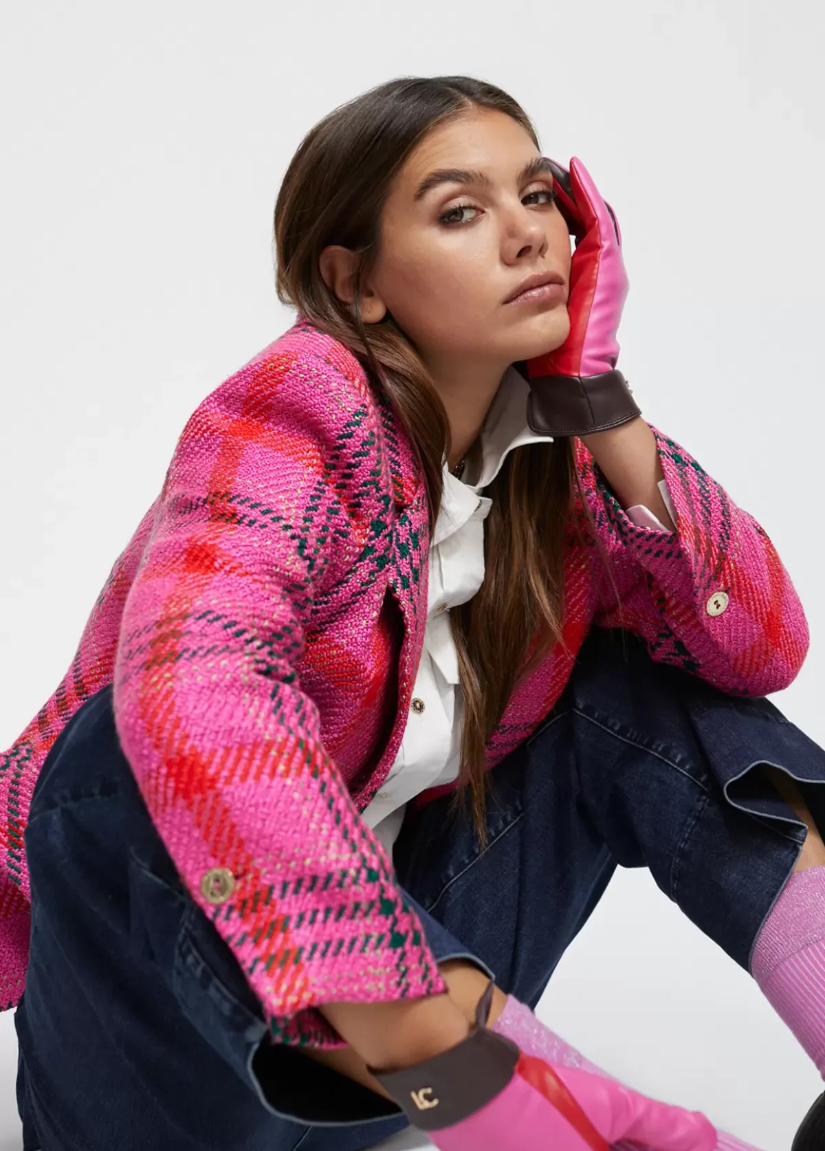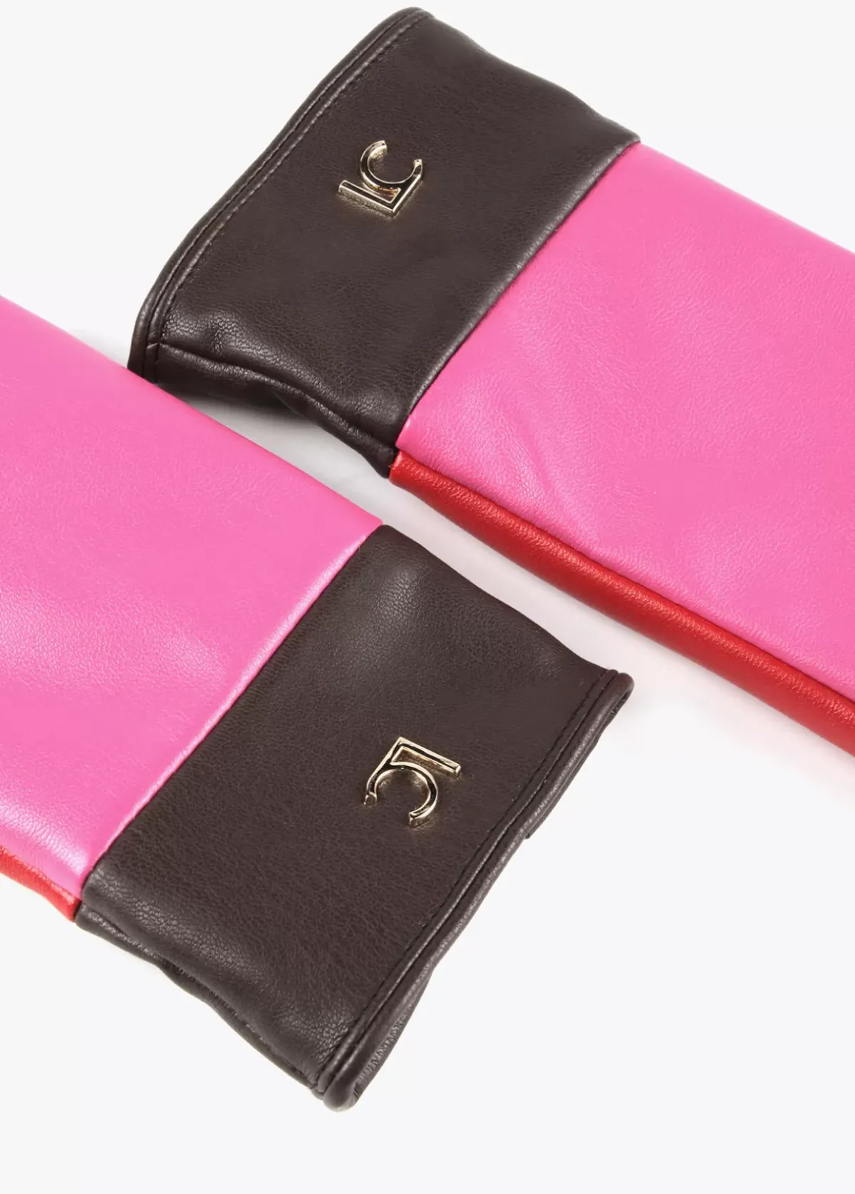 Guantes en efecto piel en tres colore combinados. Letra logo doradas en parte frontal.