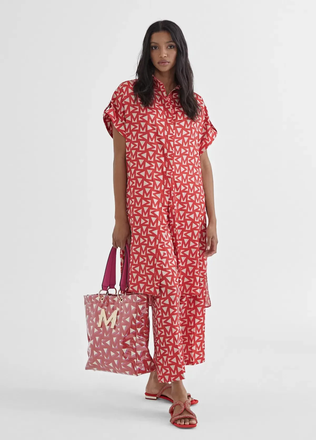 Pantalón fluido tipo cropped. Estampado monograma M bicolor. Bolsillos laterales y cierre con gancho metálico.