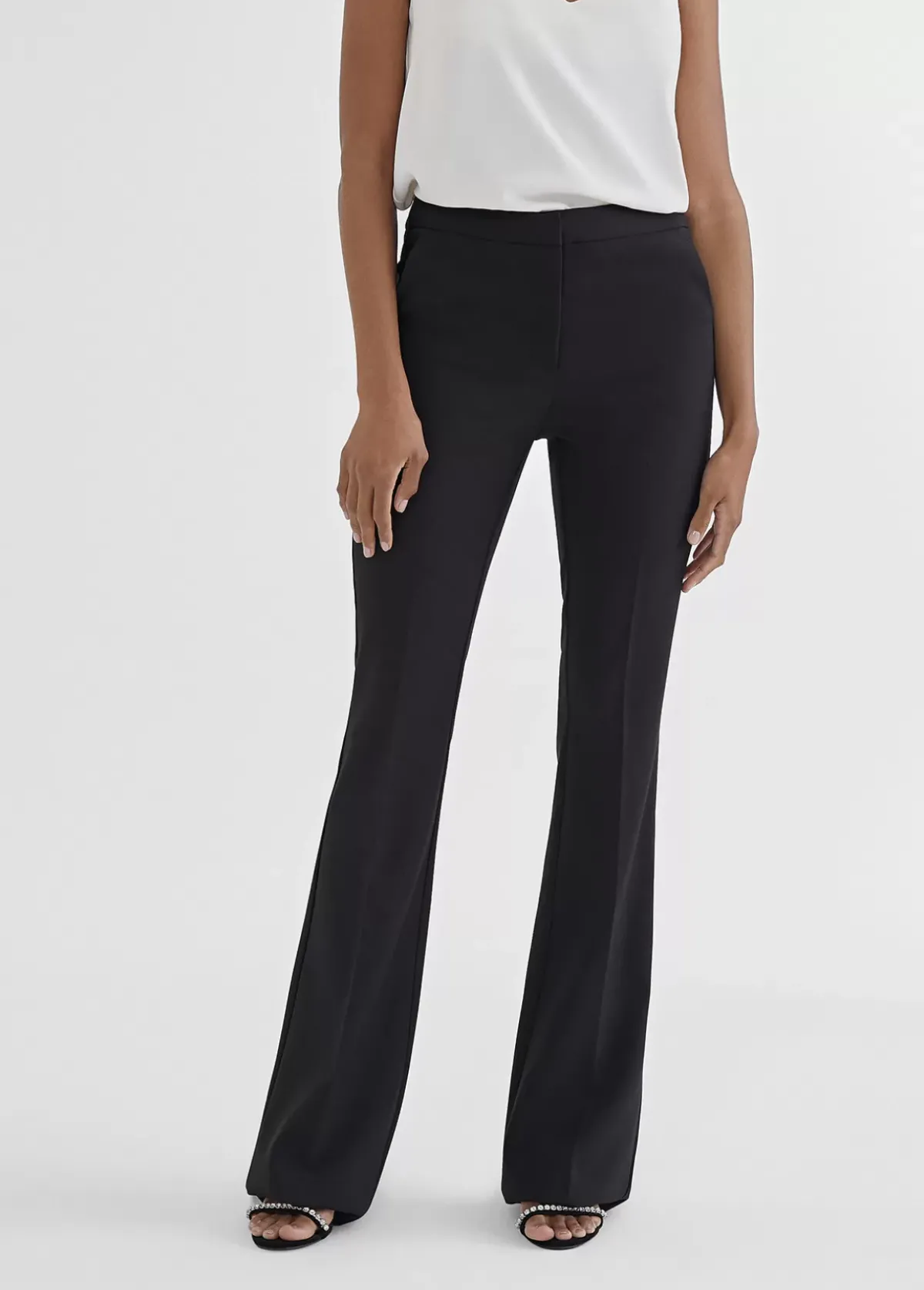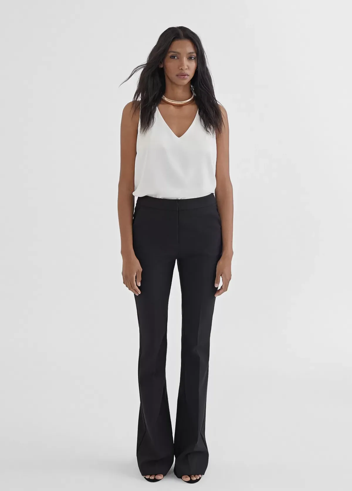 Pantalón largo y estrecho con bajo en evasé. Cierre frontal con cremallera y gancho metálico. Bolsillos laterales y falsos bolsillos traseros.
