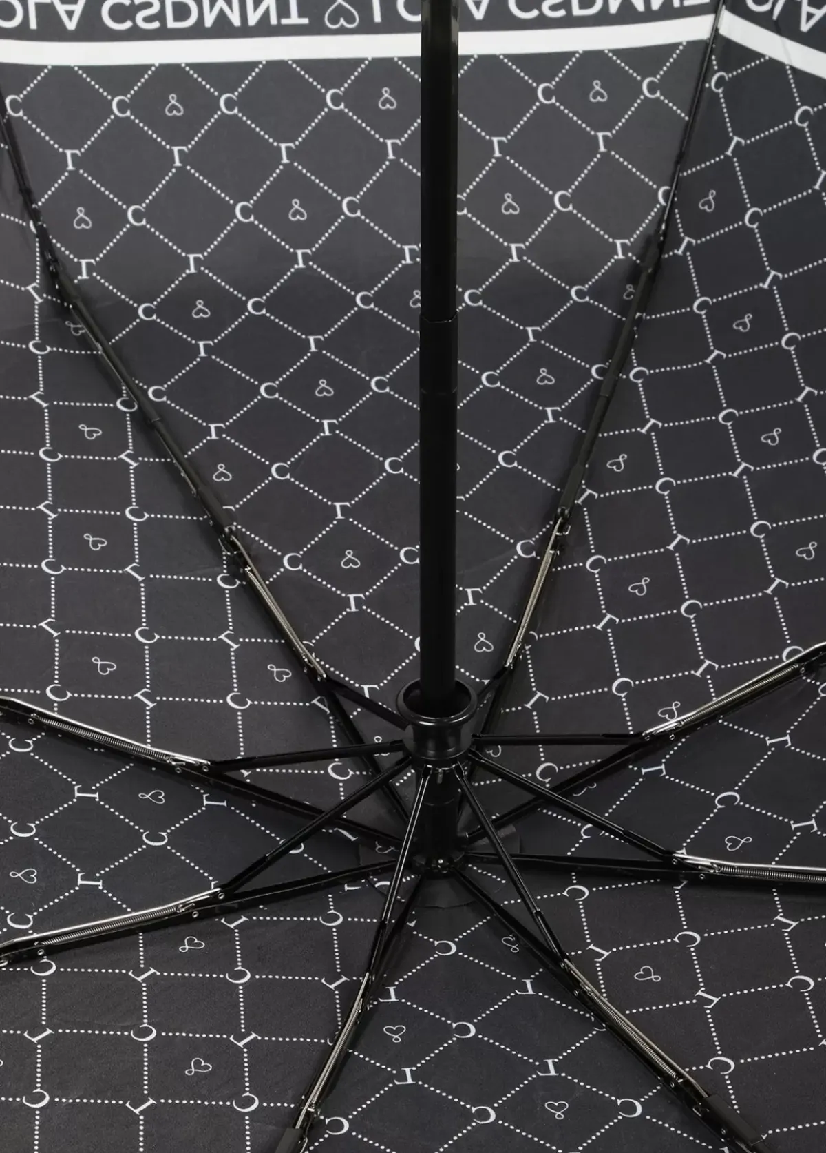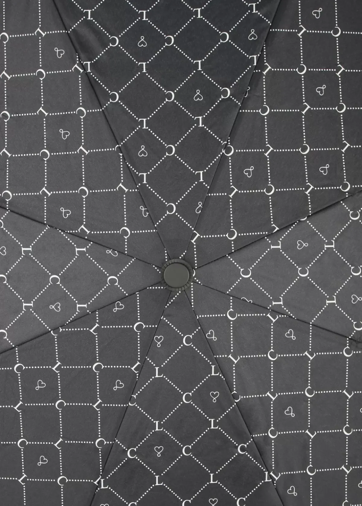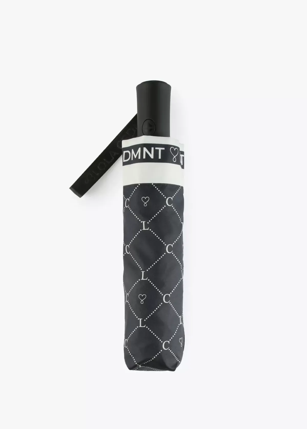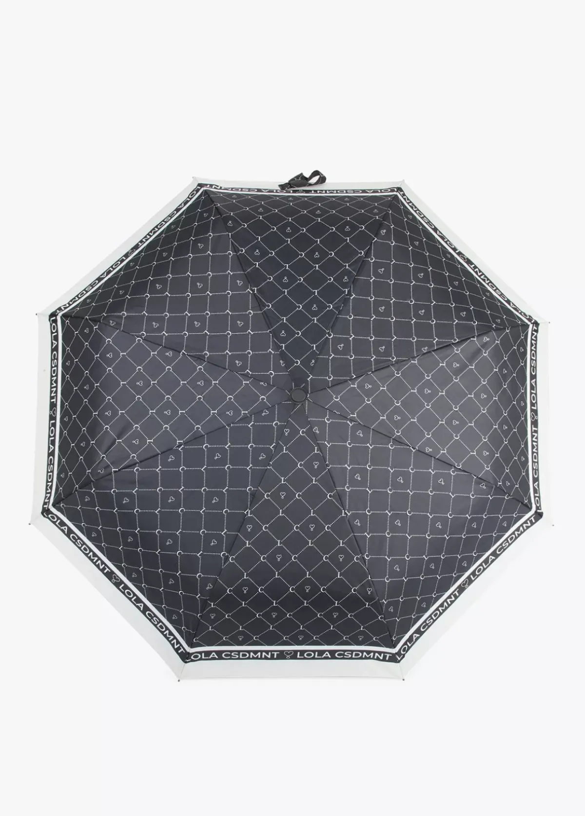 Paraguas logotipado Lola Casademunt combinado con detalles en blanco y negro. Apertura automática en tres secciones y varillaje de aluminio. Asa de mano y funda protectora con el mismo etampado.