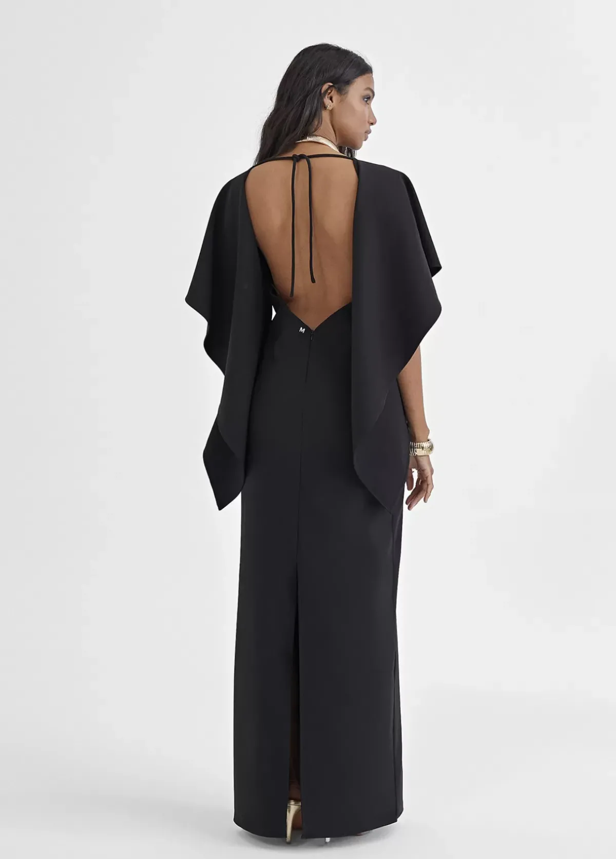 Vestido largo con mangas anchas efecto capa. Cuello caja. Espalda descubierta. Abertura en bajo falda trasera.