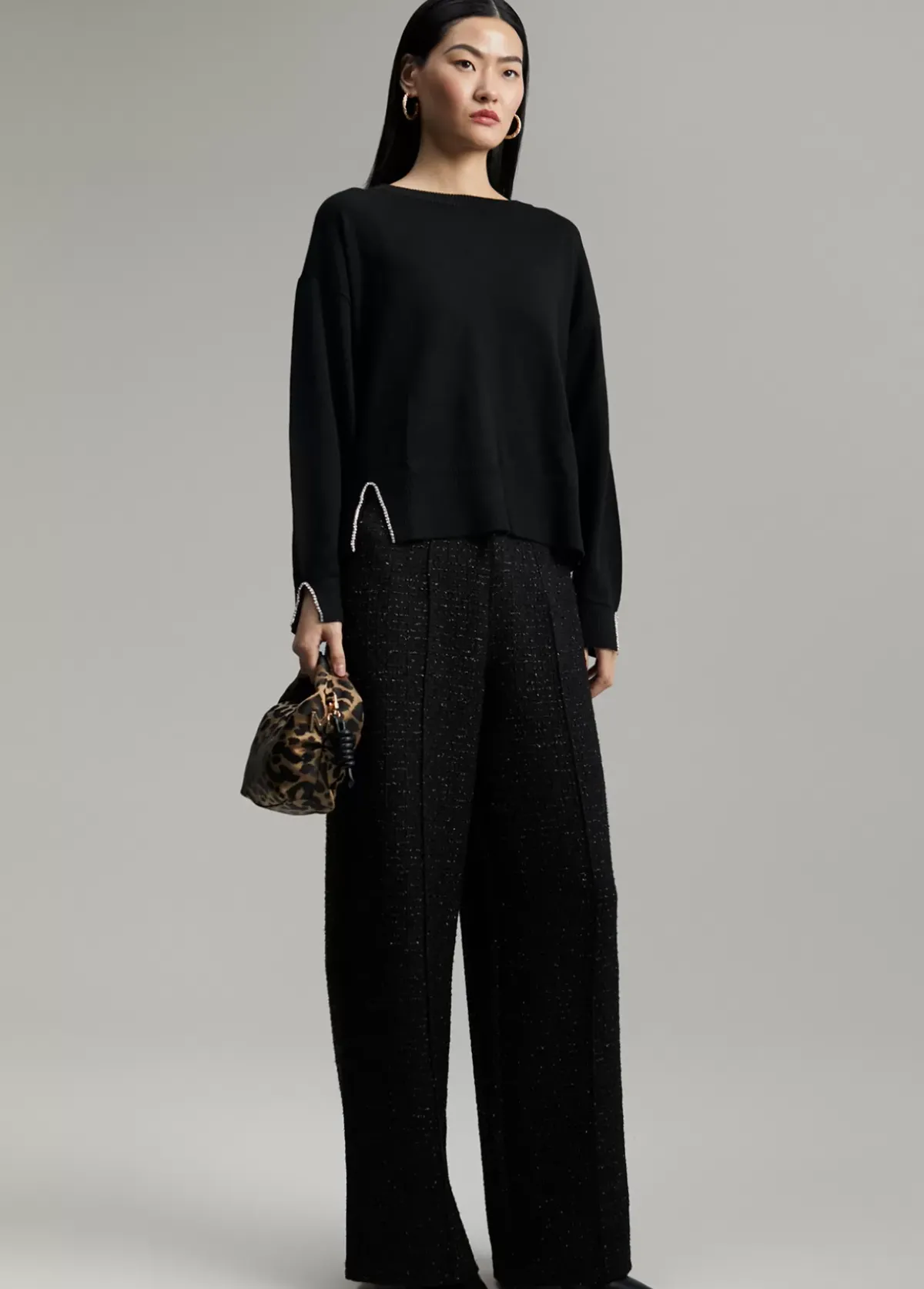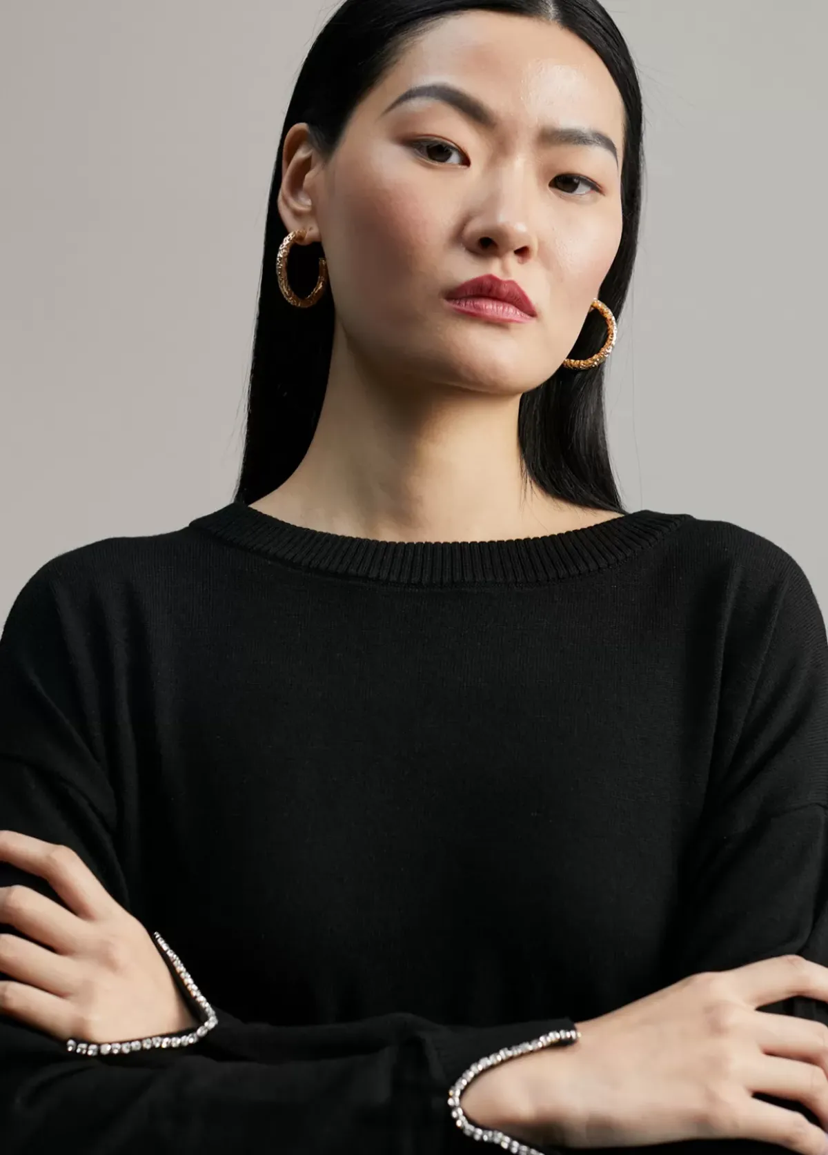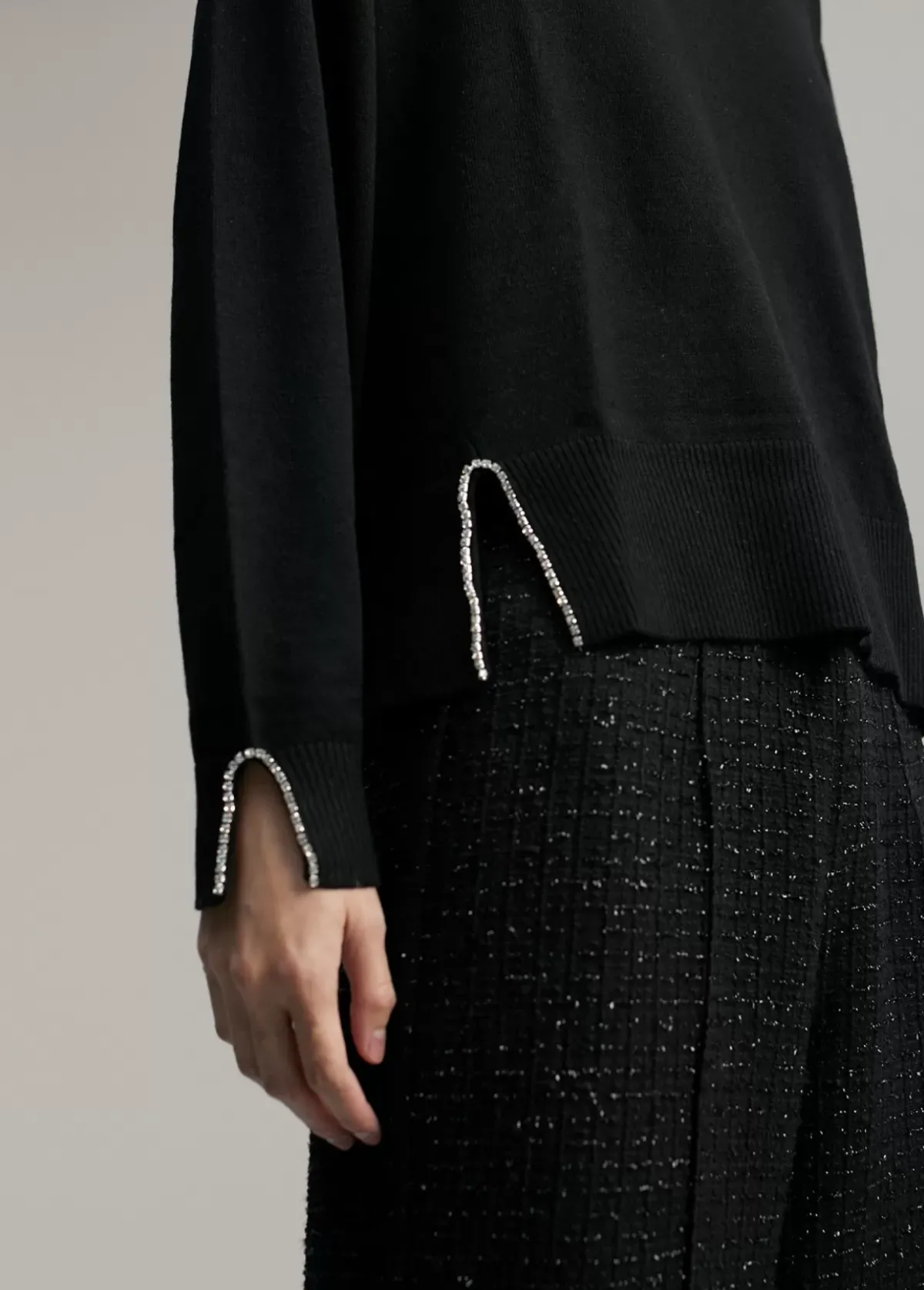 Jersey de punto y manga larga. Detalle en brillantes tipo joya en ambos lados del bajo y en puños.