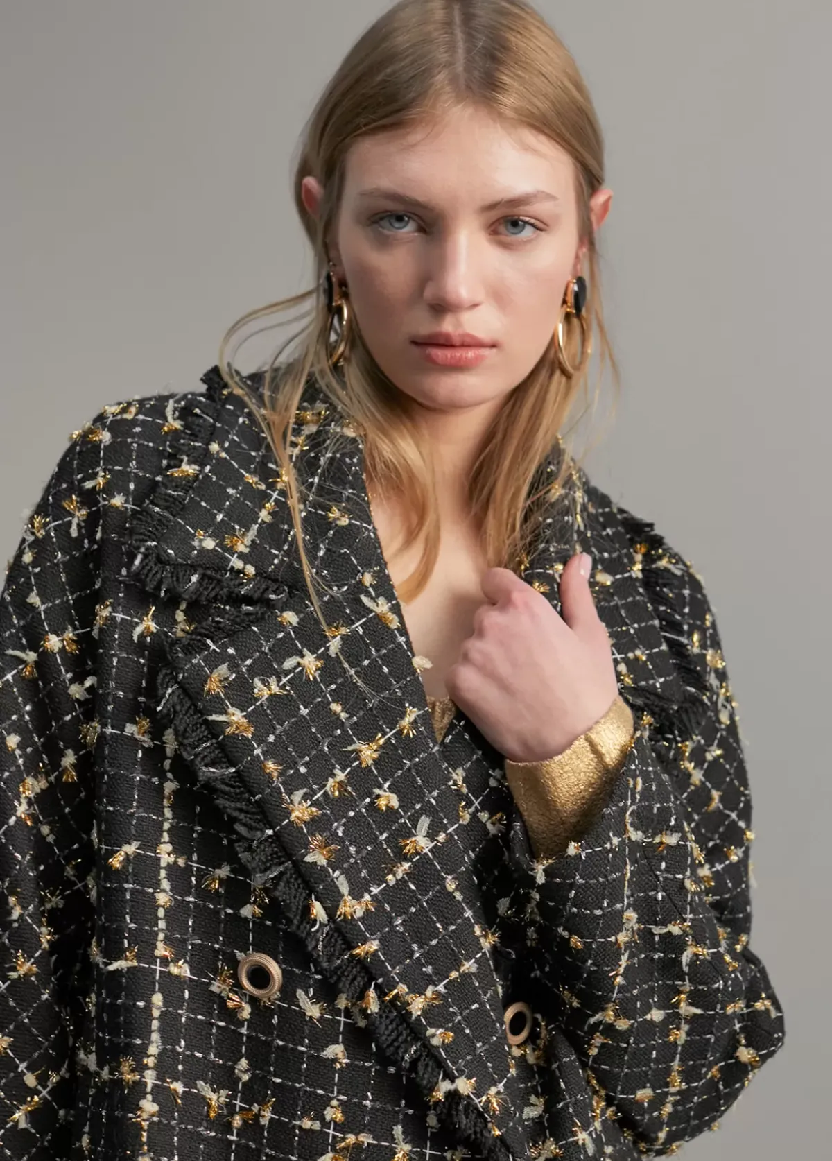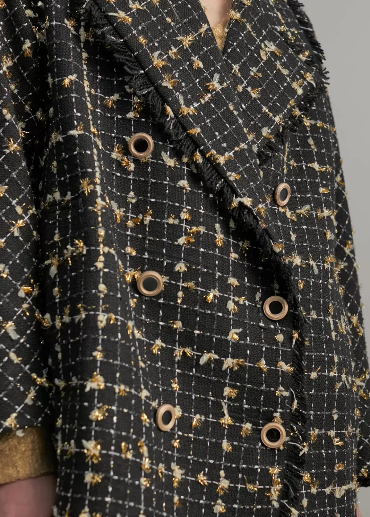 Abrigo corto de cuadros con detalle en lúrex- Cruzado, cuello solapa y cerrado con botones bicolor. Bolsillos laterales.