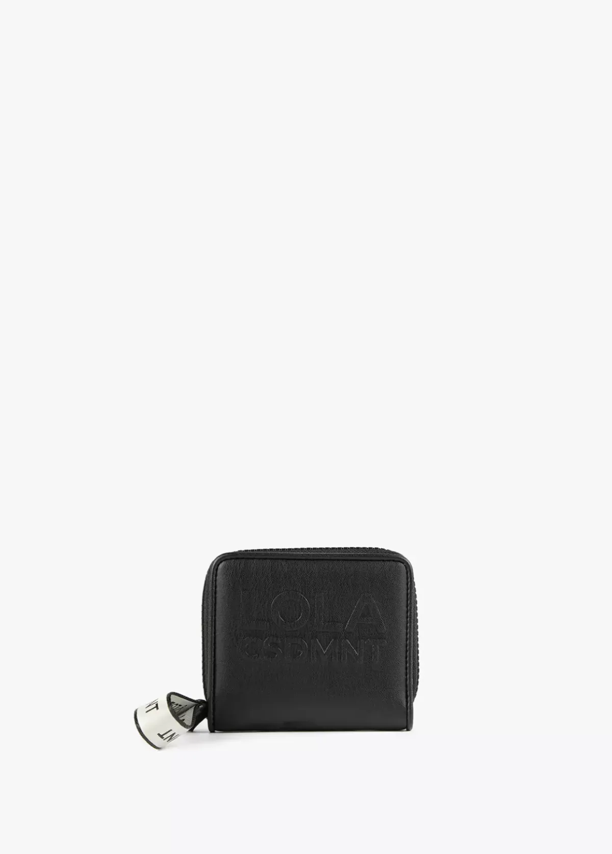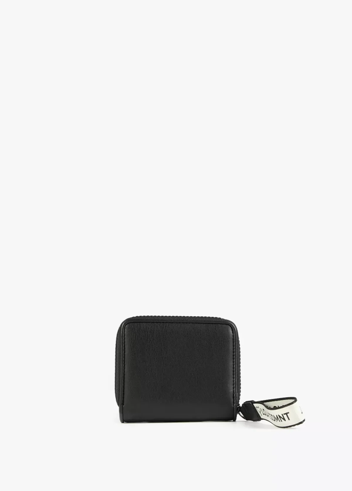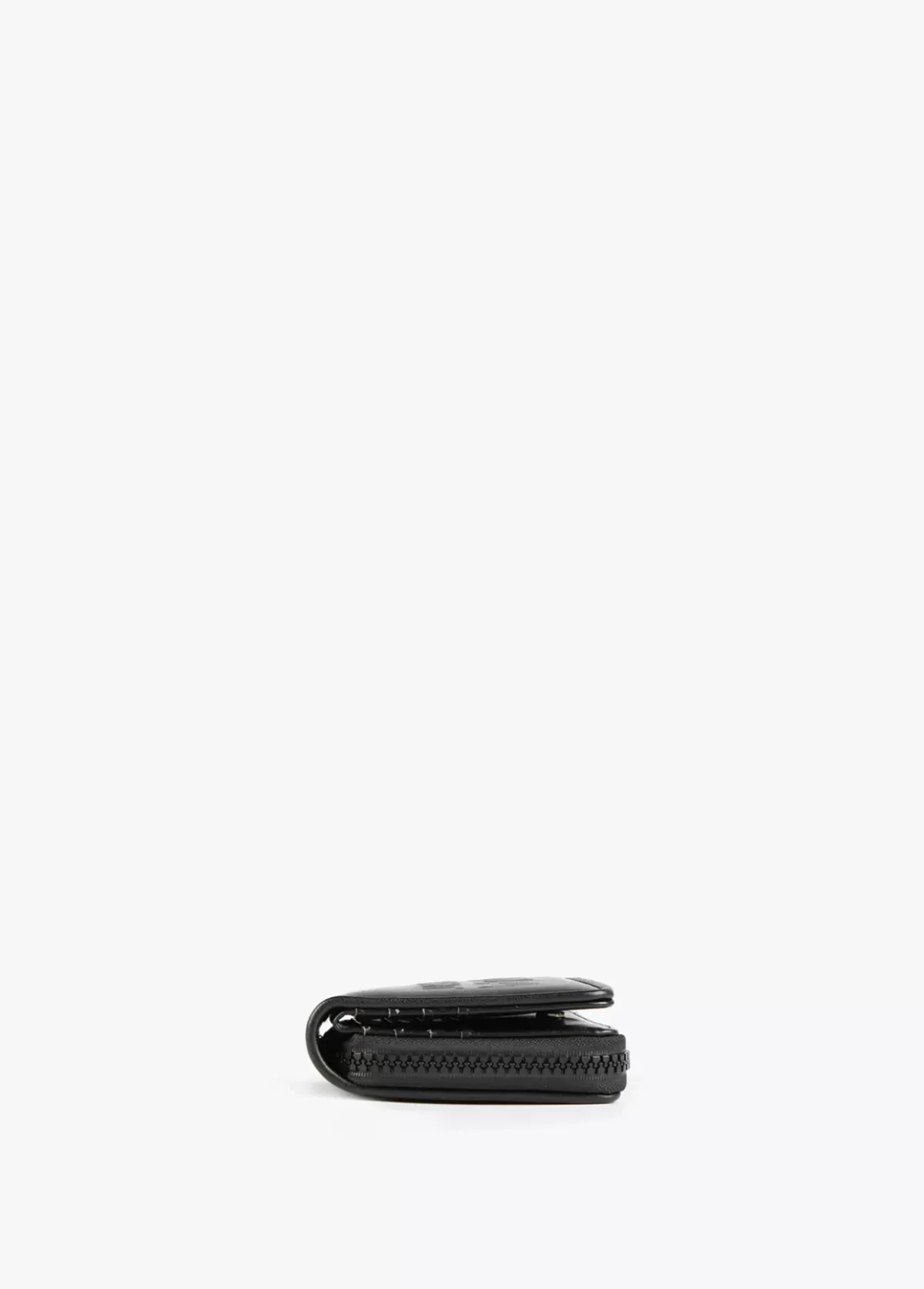 Billetero pequeño en efecto piel y logo en relieve. Asa de mano logotipada, cierre de cremallera y logo lacado en parte frontal.