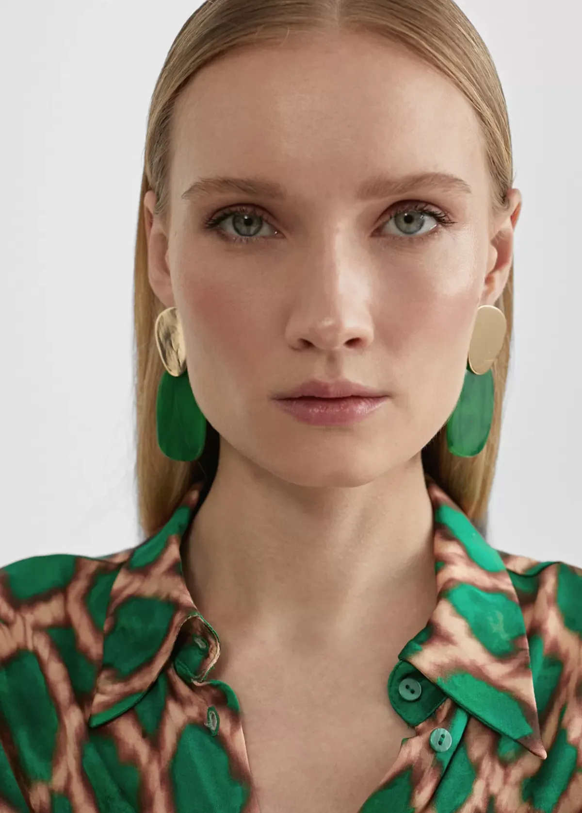 Camisa con estampado animal y lazada en cintura. Cuello camisero y botones al tono.