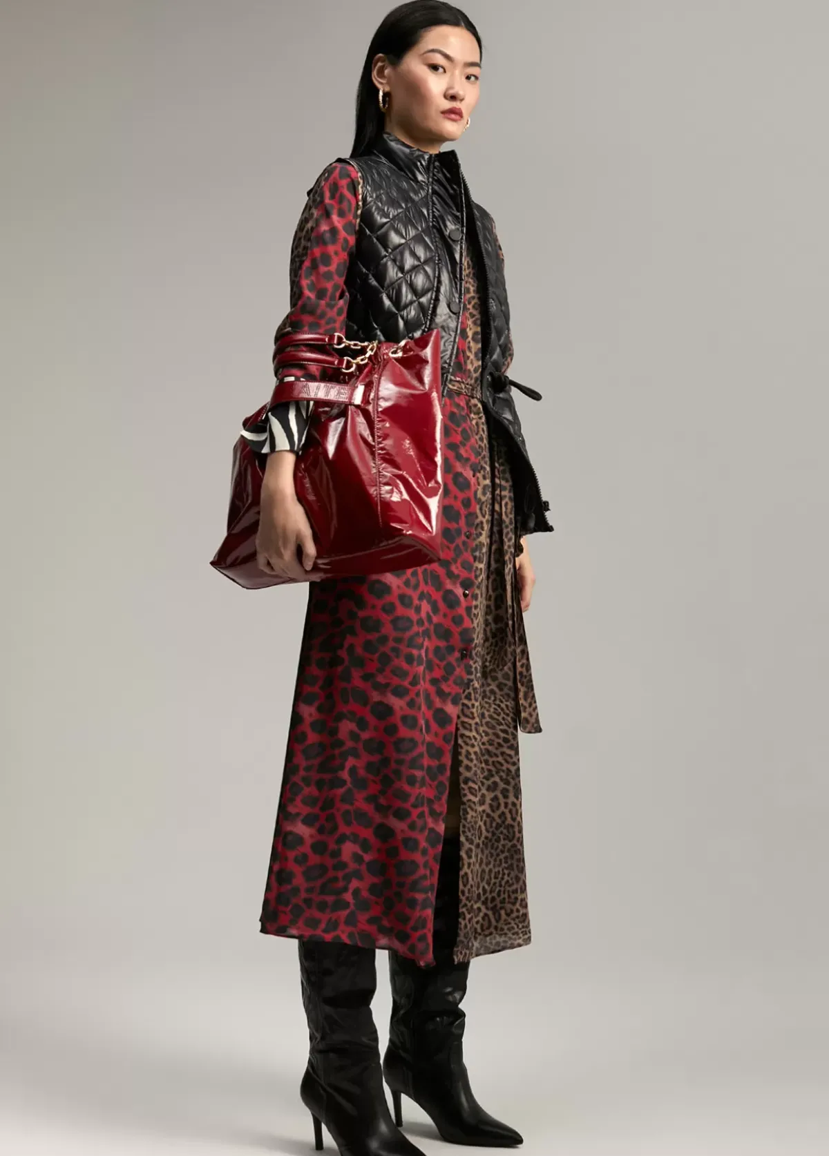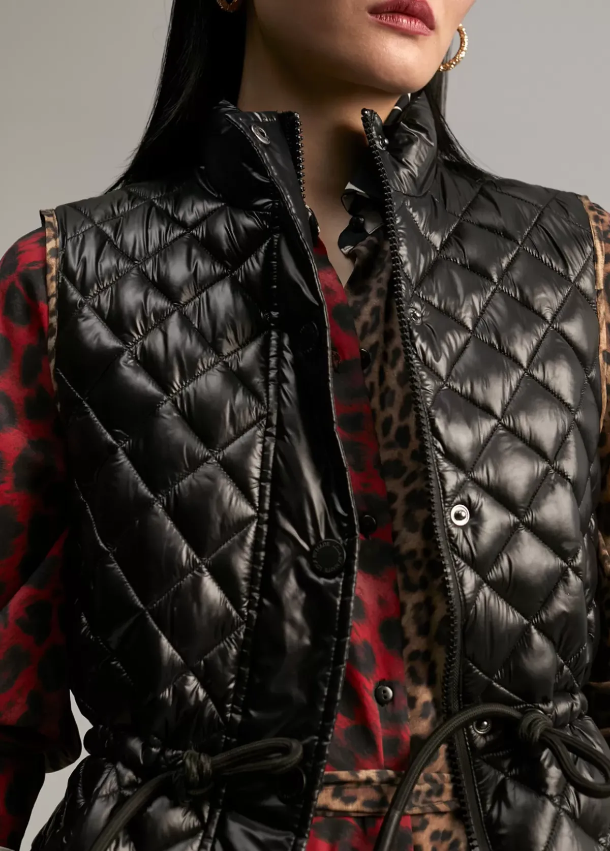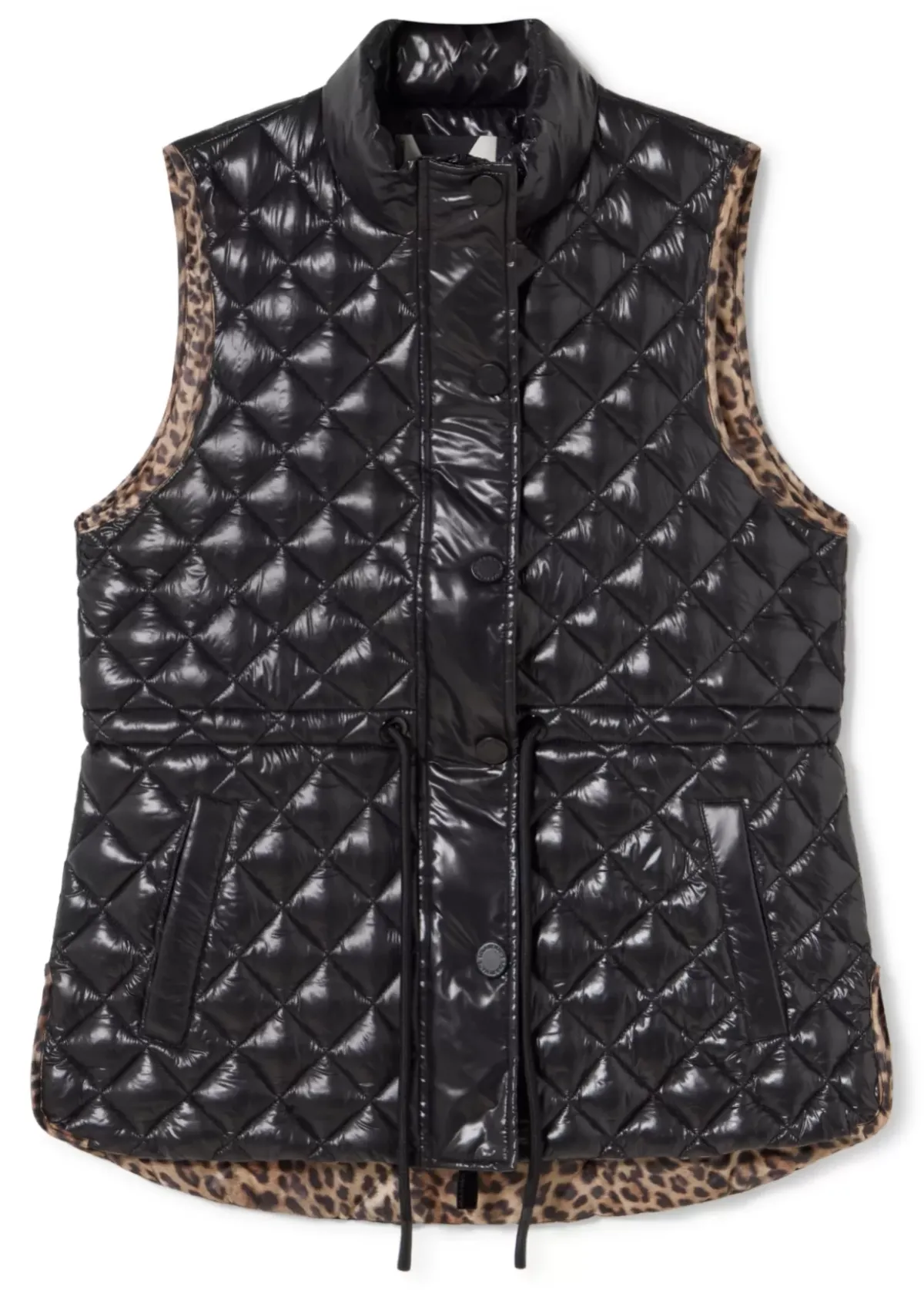Chaleco acolchado efecto charol. Cerrado con cremallera y remaches metálicos. Fruncido en cintura. Bolsillos laterales. Detalle de animal print en vivos y forro.