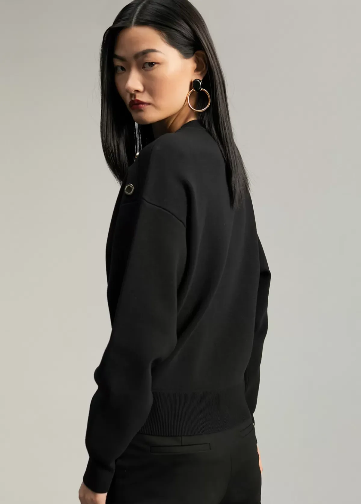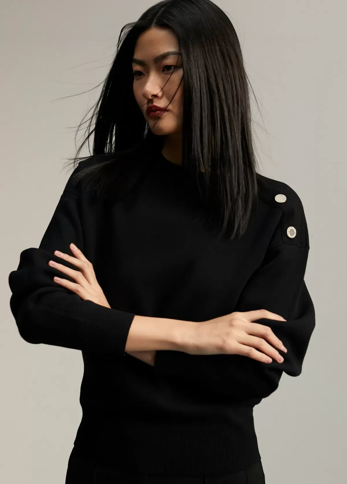 Jersey de punto de manga larga y cuello caja. Detalle de botones dorados en hombro.