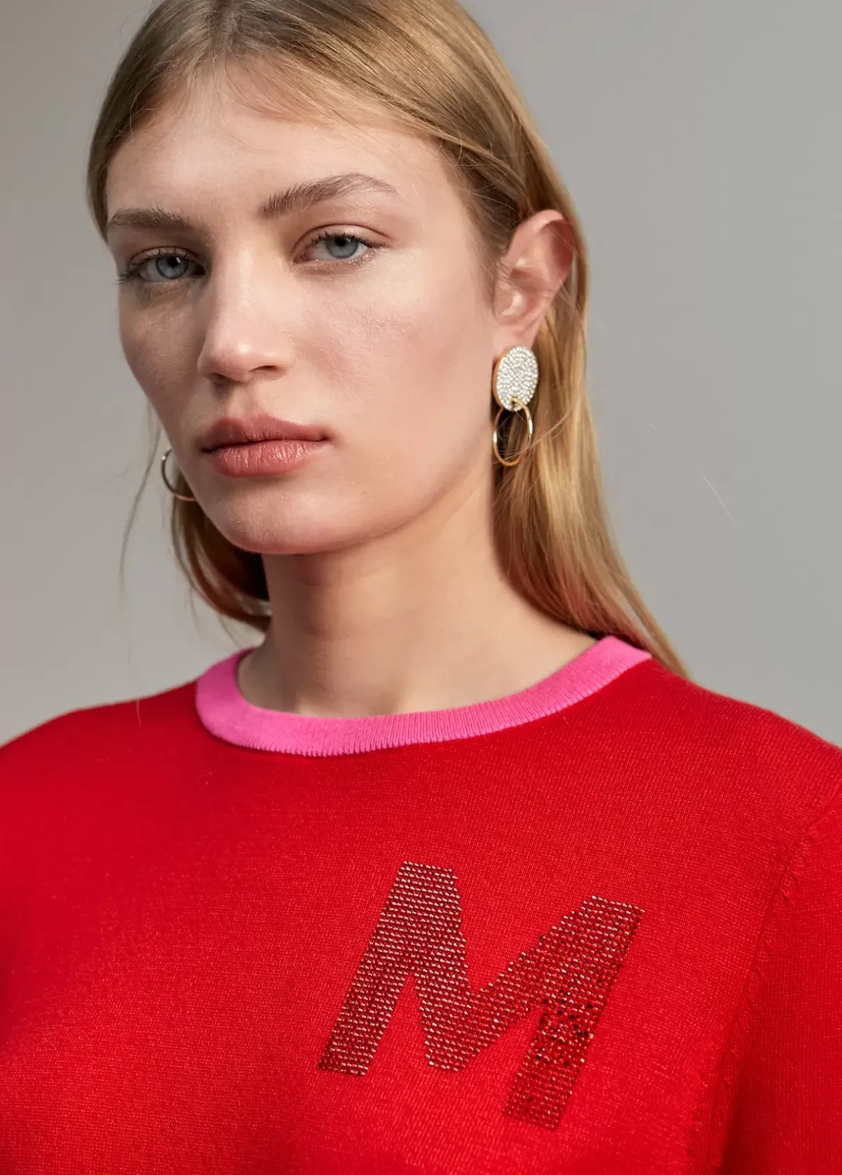 Jersey cuello caja y manga larga. Detalle de M en strass a tono en frontal. Rib de cuello, puños y bajo contrastado en otro color.