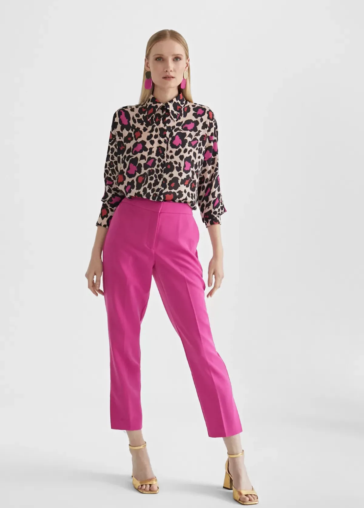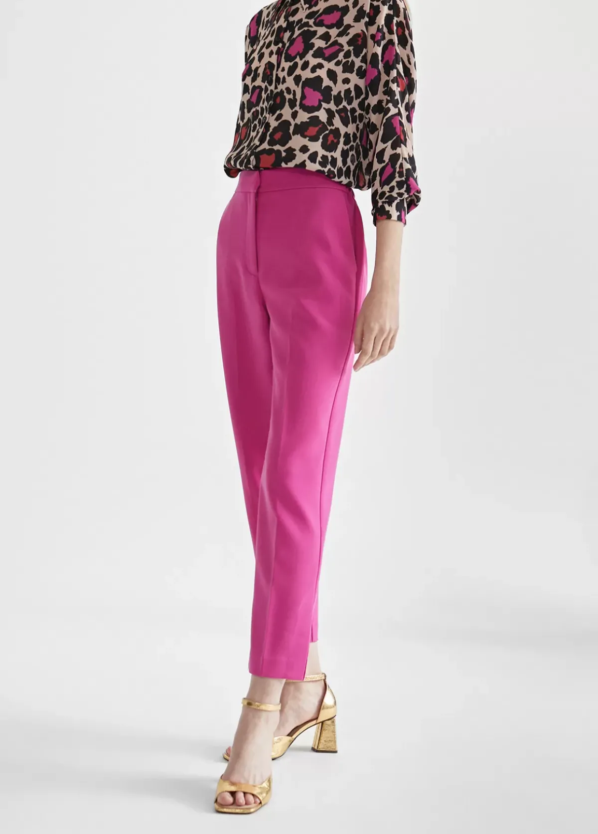 Pantalón en color fucsia y goma en cintura con aberturas laterales en bajo. Cierre con cremallera y botón invisible. Falsos bolsillos traseros con letra logo dorada. Bolsillos laterales.