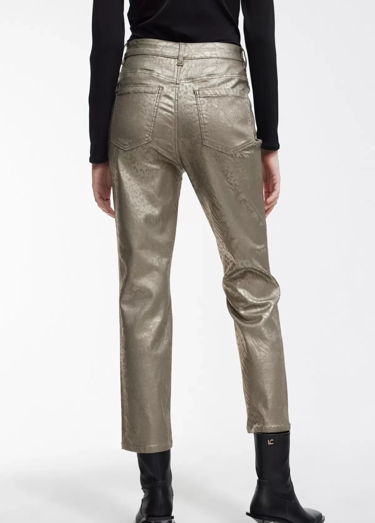 Pantalón en tejido estampado animal print a tono. Bolsillos plastrón en frontal y en parte trasera. De largo tobillero.