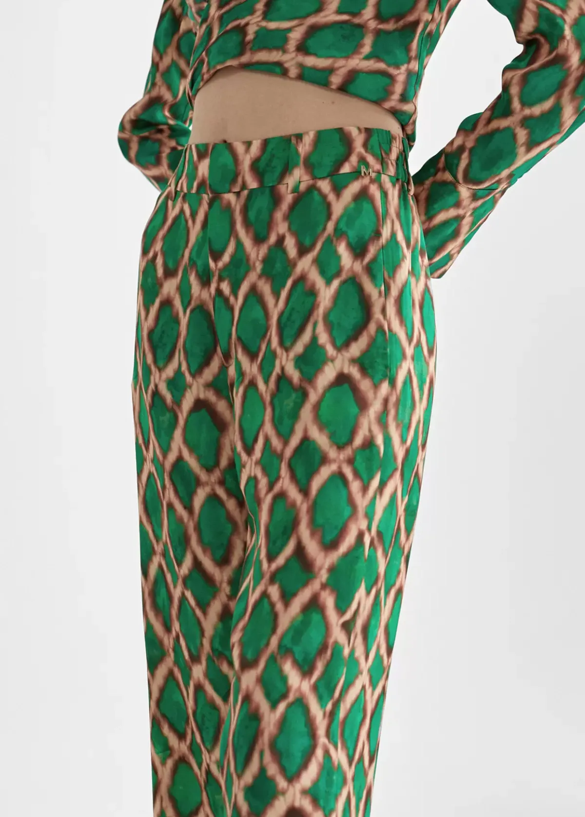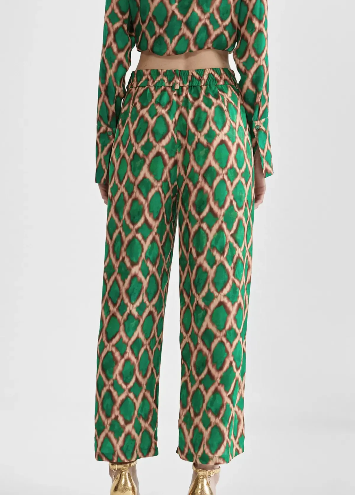 Pantalón de tejido fluido en estampado romboide. Cintura elástica y bolsillos laterales. Largo tobillero.