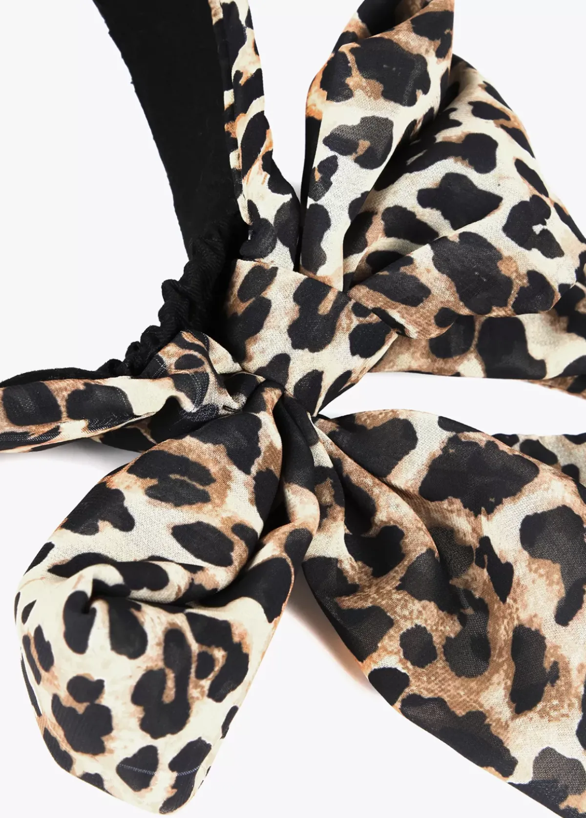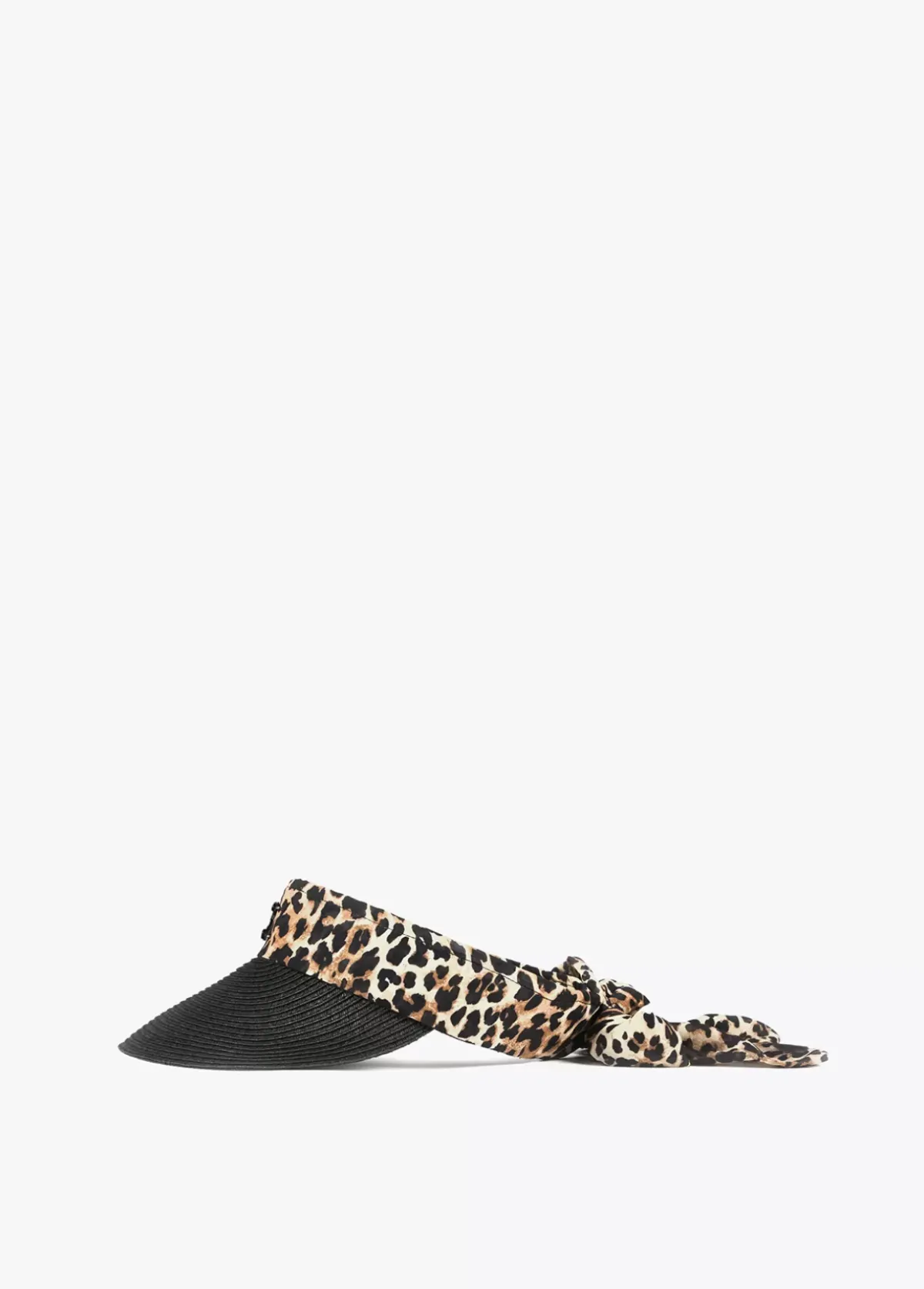Visera efecto ráfia con lazo de tejido estampado animal y logo lacado en parte frontal.