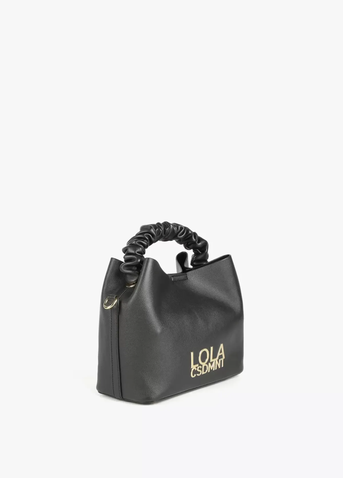 Bolso tipo bandolera en efecto piel con asa fruncida y mega logo dorado en parte frontal. Cierre con cremallera y asa bandolera ajustable y extraíble.