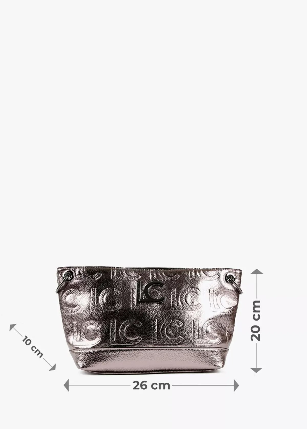 Bolso bandolera efecto piel metalizado y grabado. Letras logo frontales al tono. Bolsillo exterior y cierre central con cremallera.