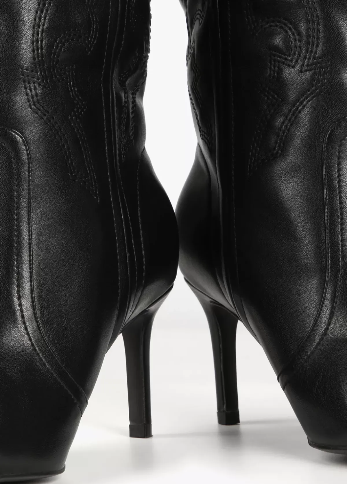 Bota de caña alta estilo cowboy con tacón fino y dibujo pespunteado. Detalle letra logo dorada en lateral.