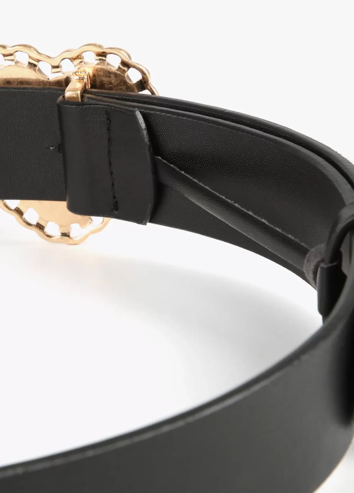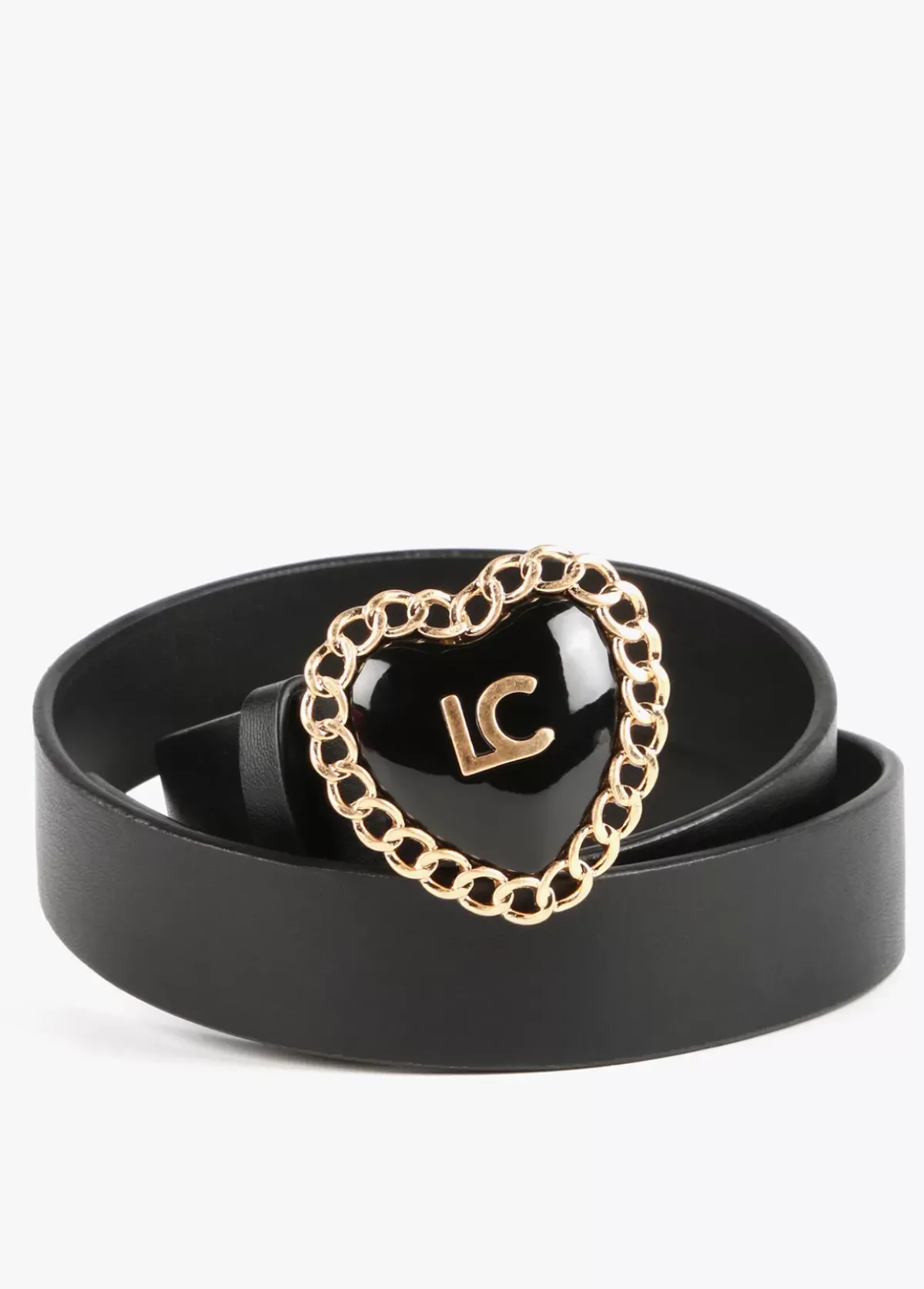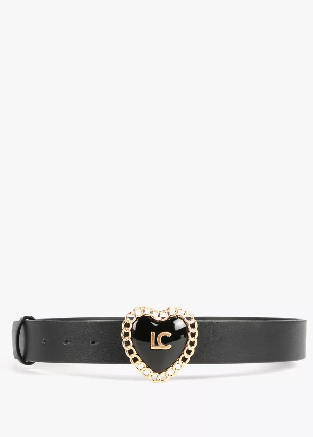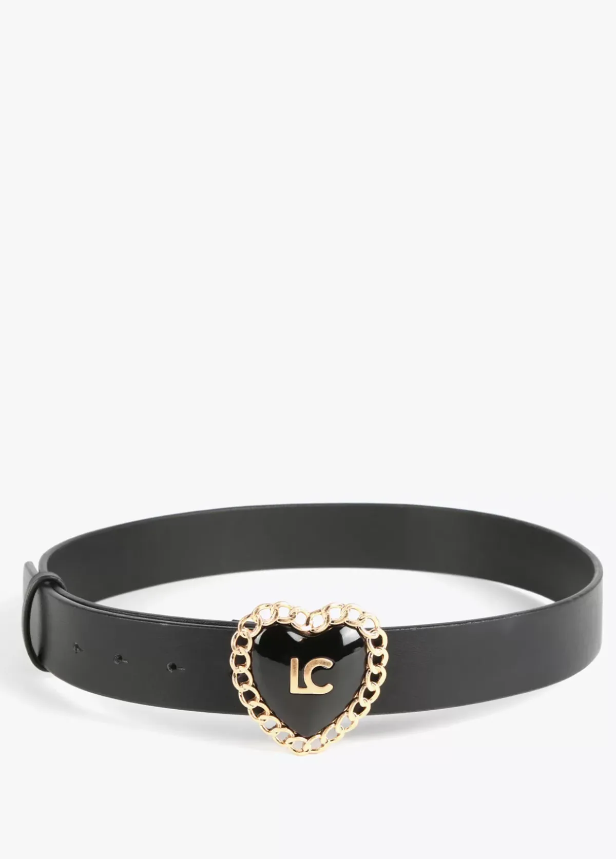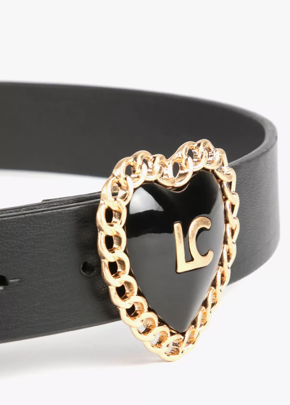 Cinturón en efecto piel negro con hebilla corazón encadenado y letras logo doradas.