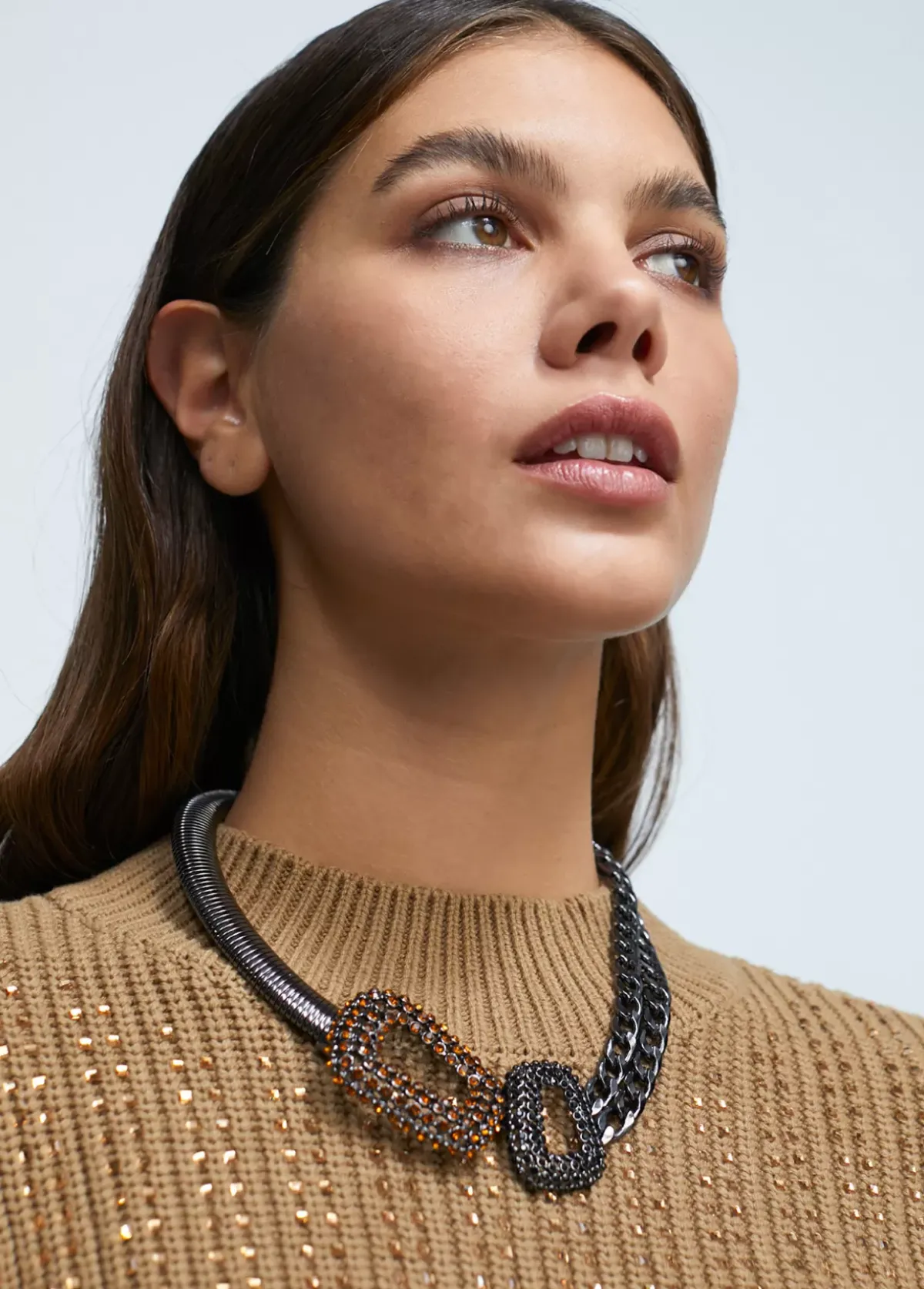 Collar tipo gargantilla con dos tipos de cadena combinadas y pieza con cristales a modo de abalorio.