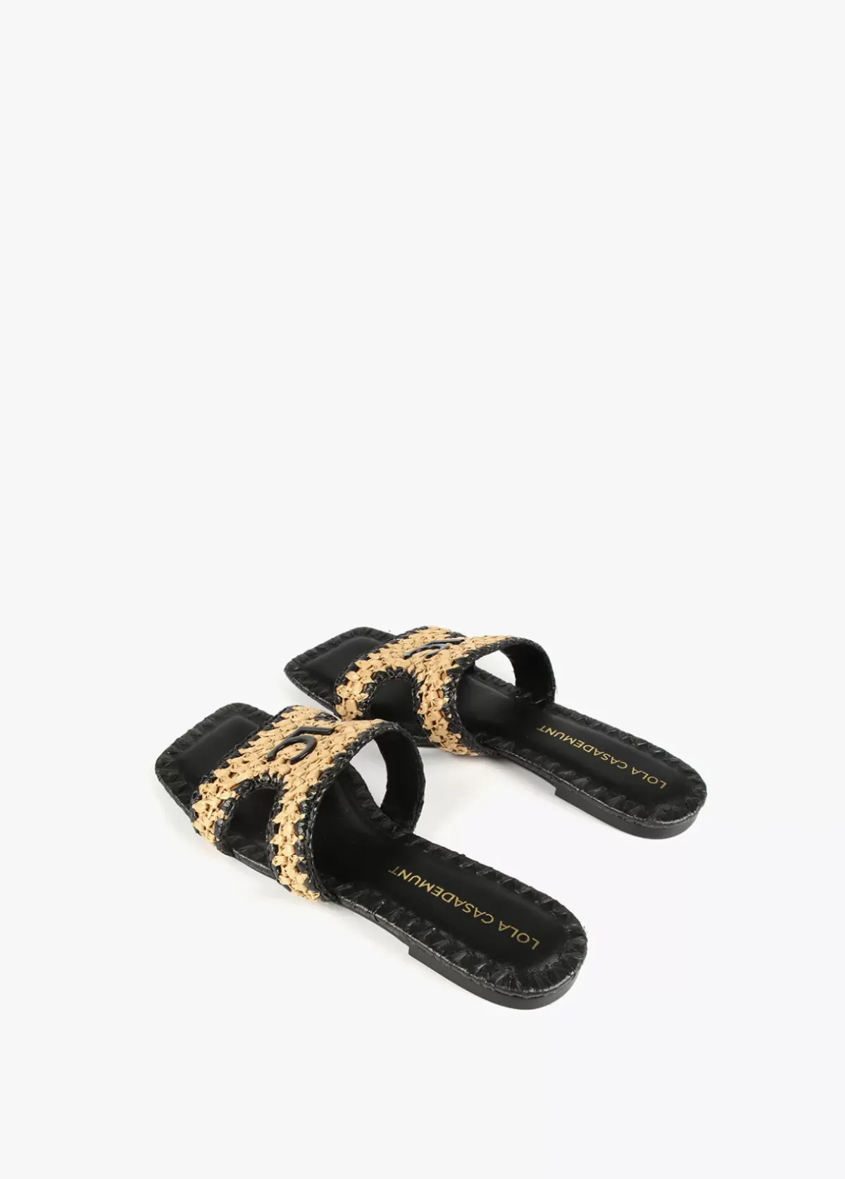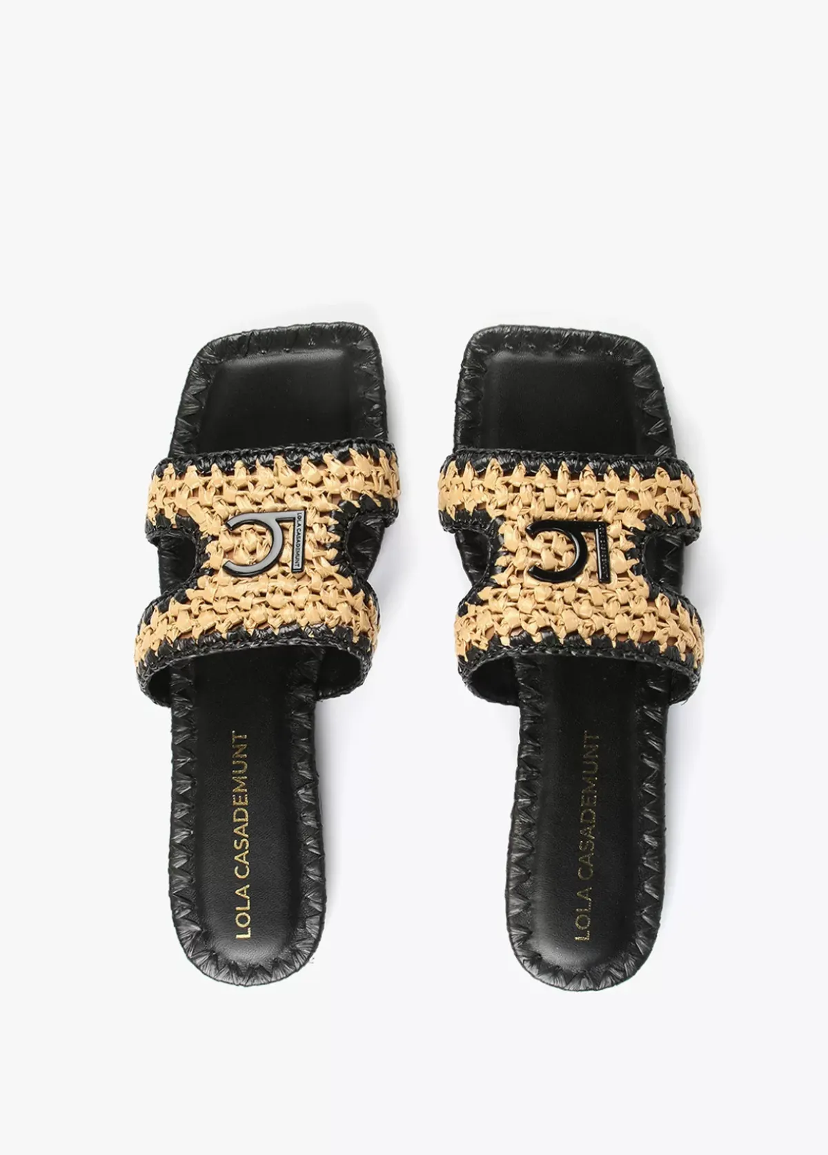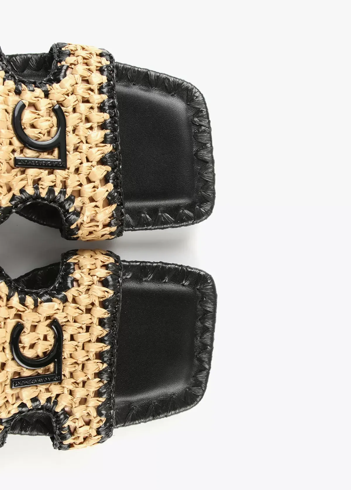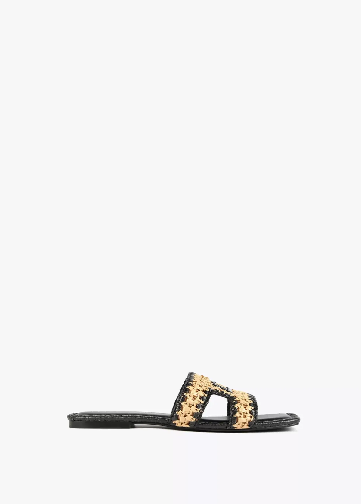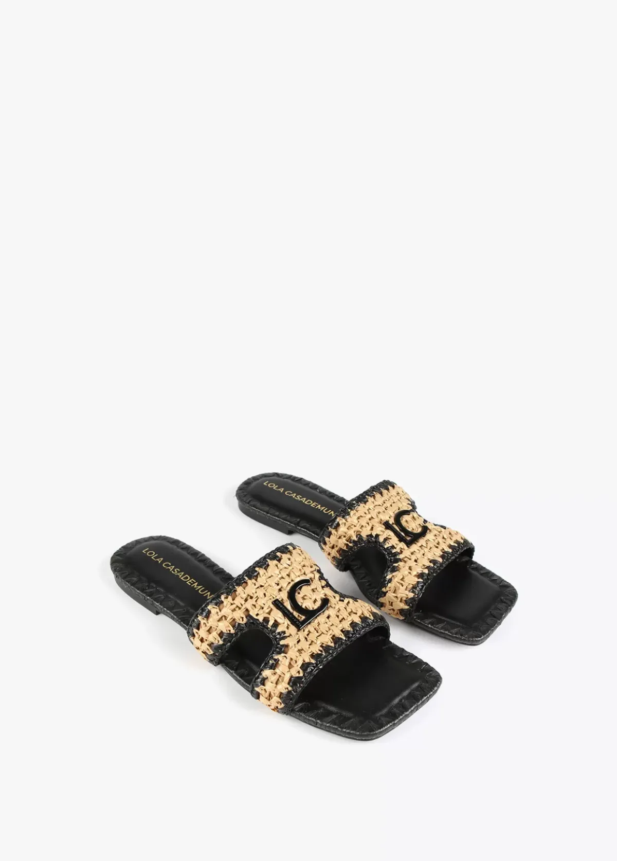 Sandalia tipo pala en efecto piel negro y efecto ráfia. Plantilla logotipada y detalla letras logotipo lacadas en la pala.