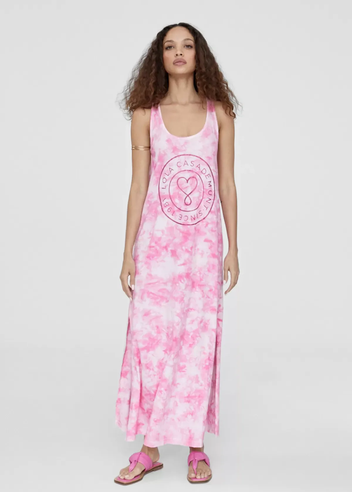 Vestido largo en estampado tie dye. Escote redondeado y tirantes. Logo posicionadao en frontal a contraste. Aberturas laterales en bajo.